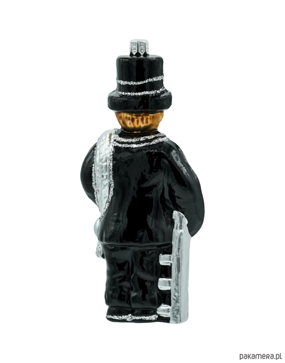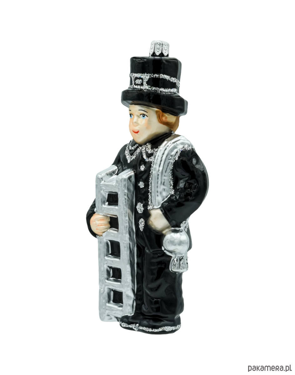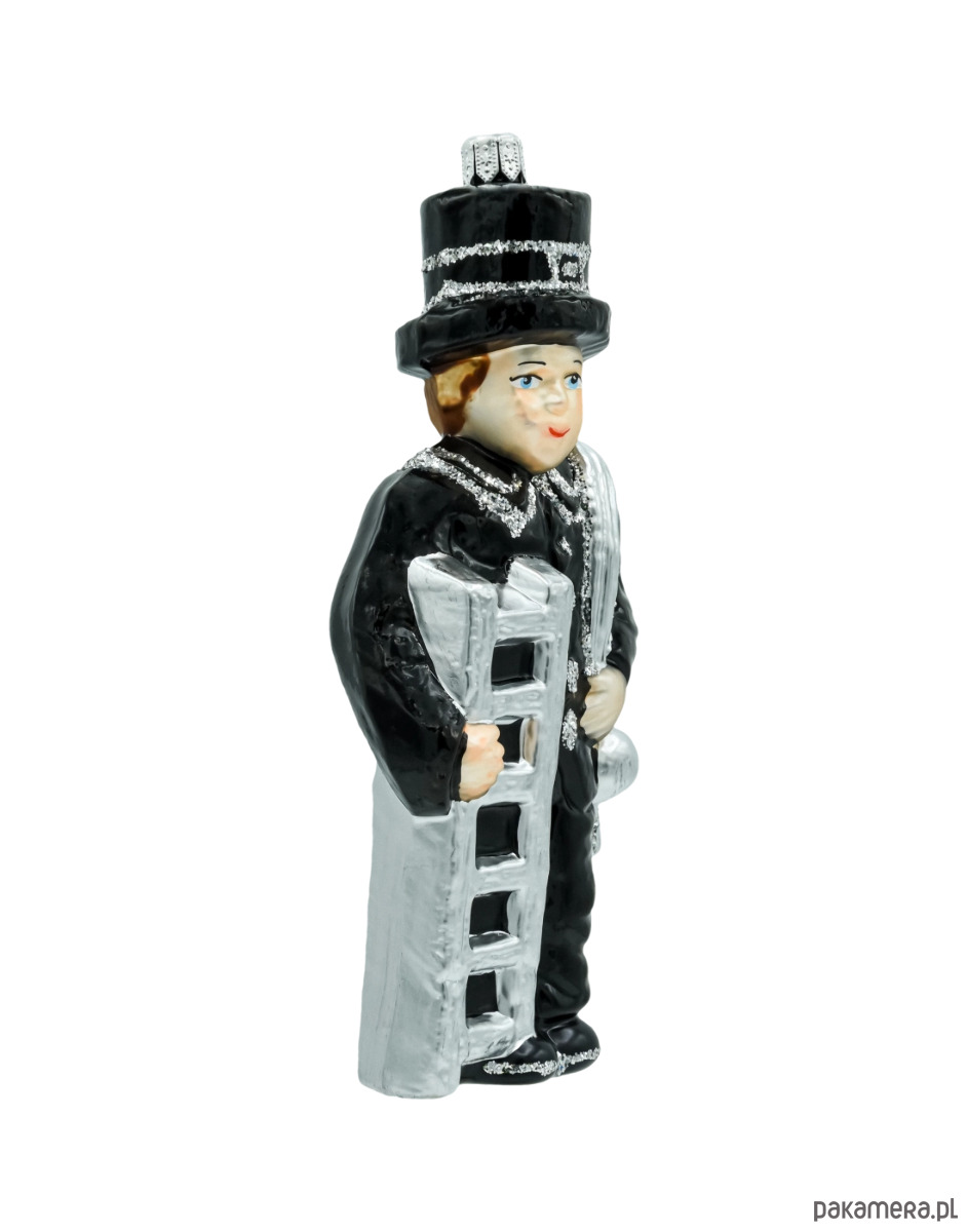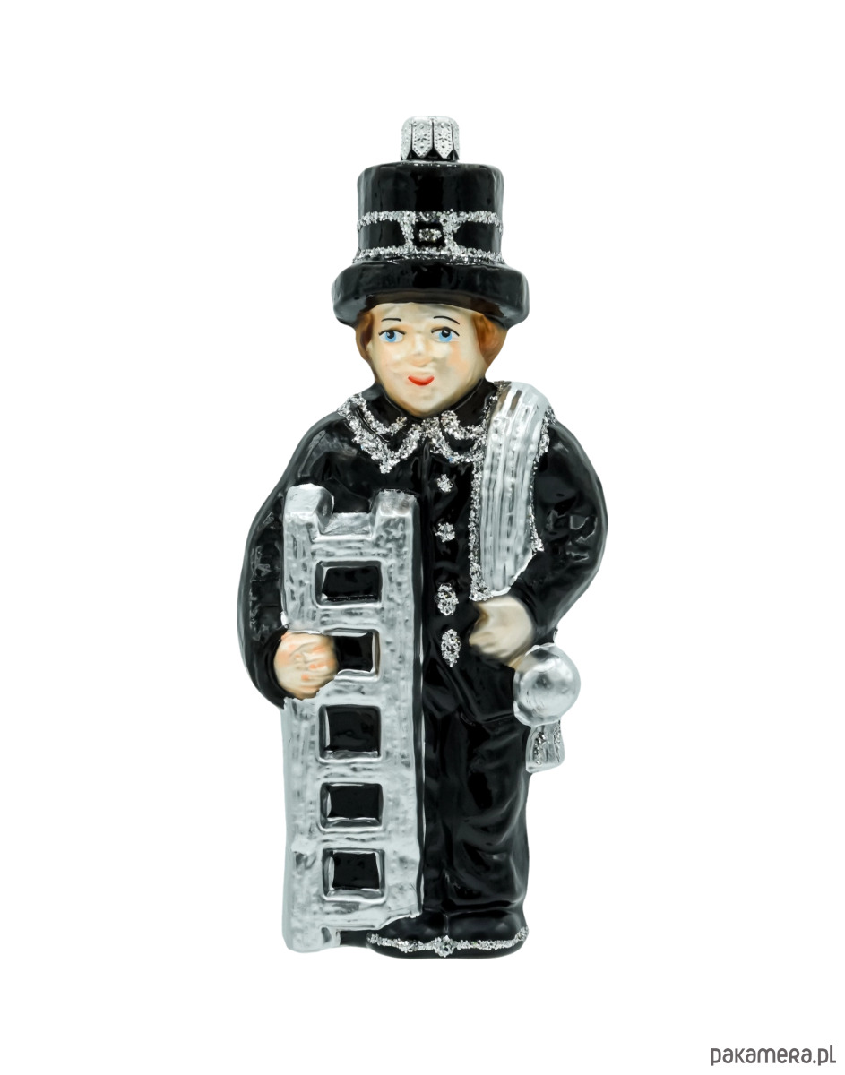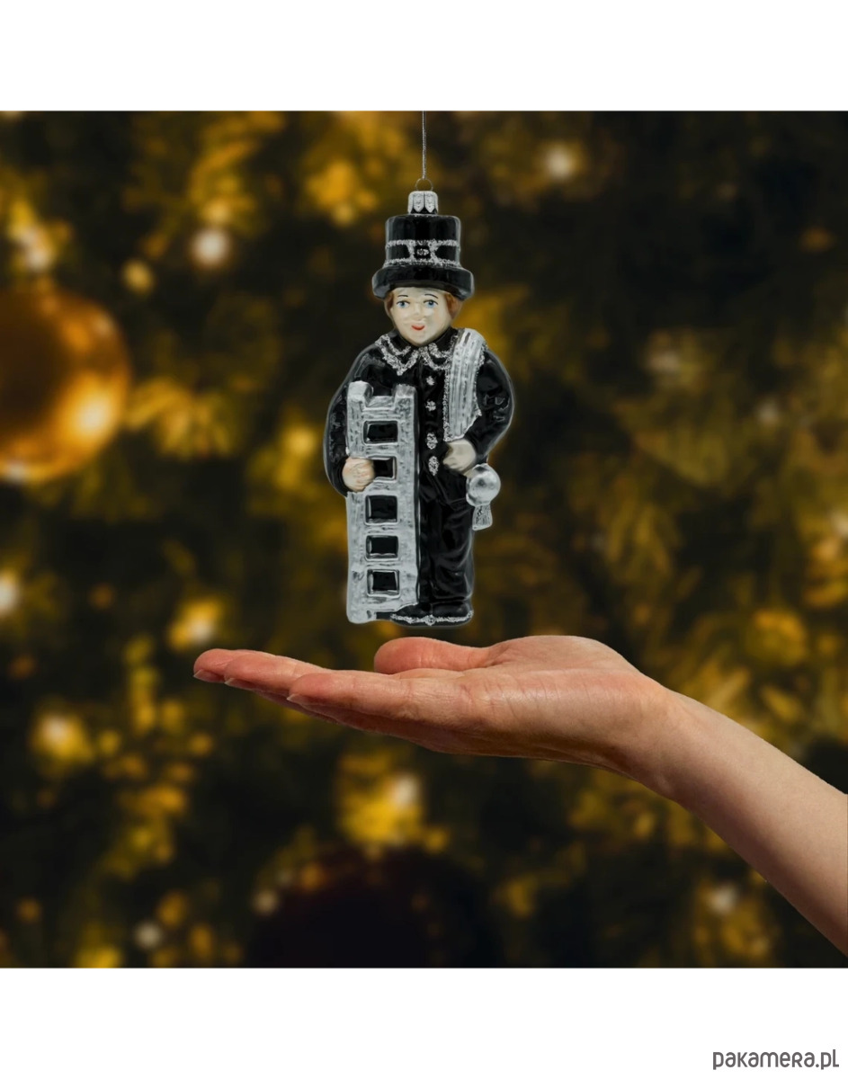 Wprowadź do świątecznego wnętrza odrobinę tradycji i dobrego uroku. Figuralna bombka Kominiarz to ręcznie zdobiona ozdoba choinkowa wykonana z dmuchanego szkła. Postać kominiarza w klasycznym czarnym fraku i cylindrze, z srebrną drabiną i wyciorem przewieszonym przez ramię, została pomalowana w najdrobniejszych detalach i podkreślona srebrnym brokatem. Symbol kominiarza od wieków kojarzy się ze szczęściem i pomyślnością – dlatego ta polska bombka szklana świetnie sprawdzi się zarówno na choince, jak i w roli prezentu na Boże Narodzenie czy Nowy Rok.