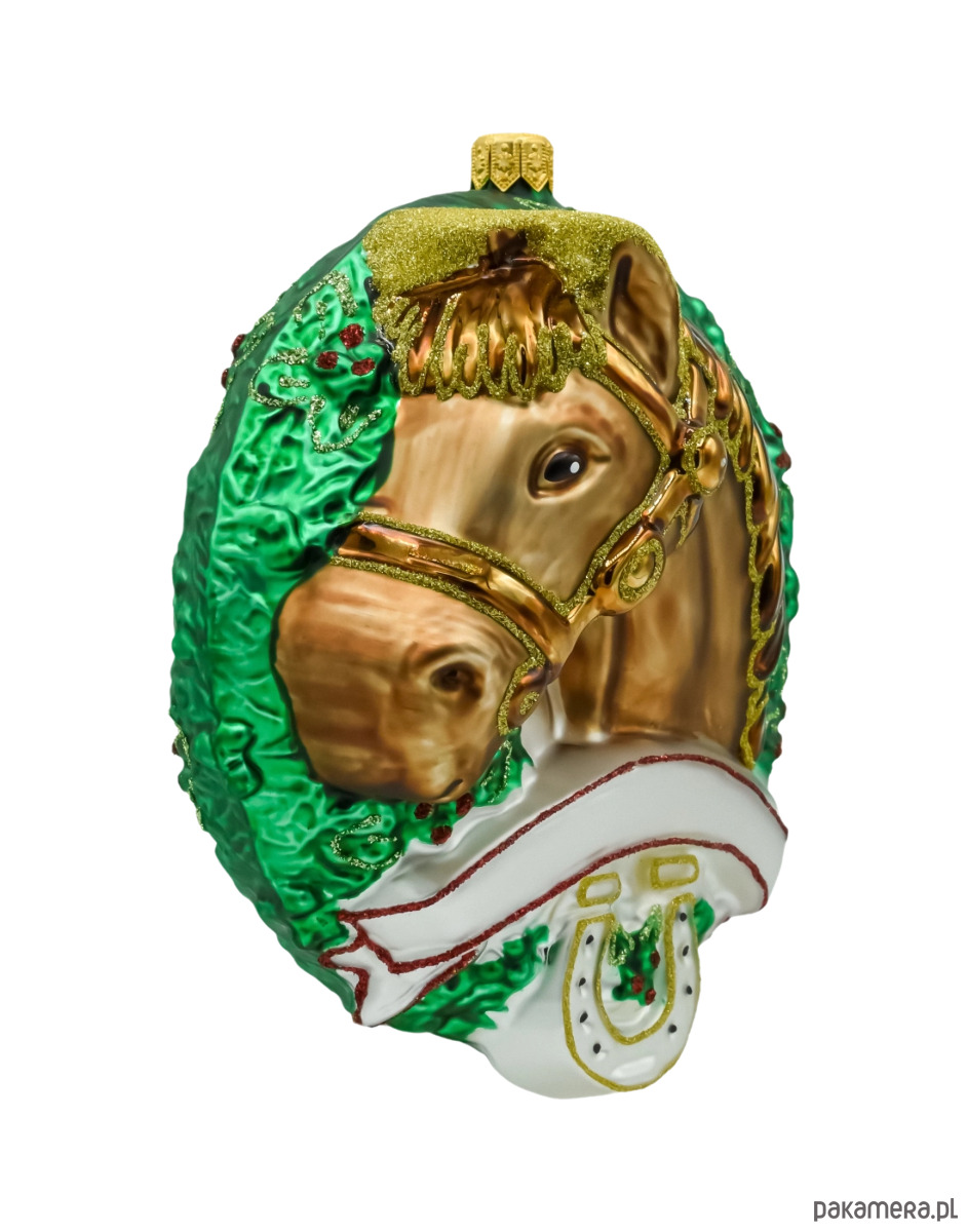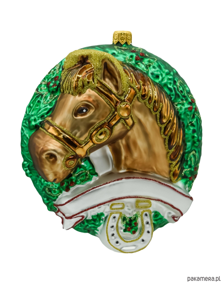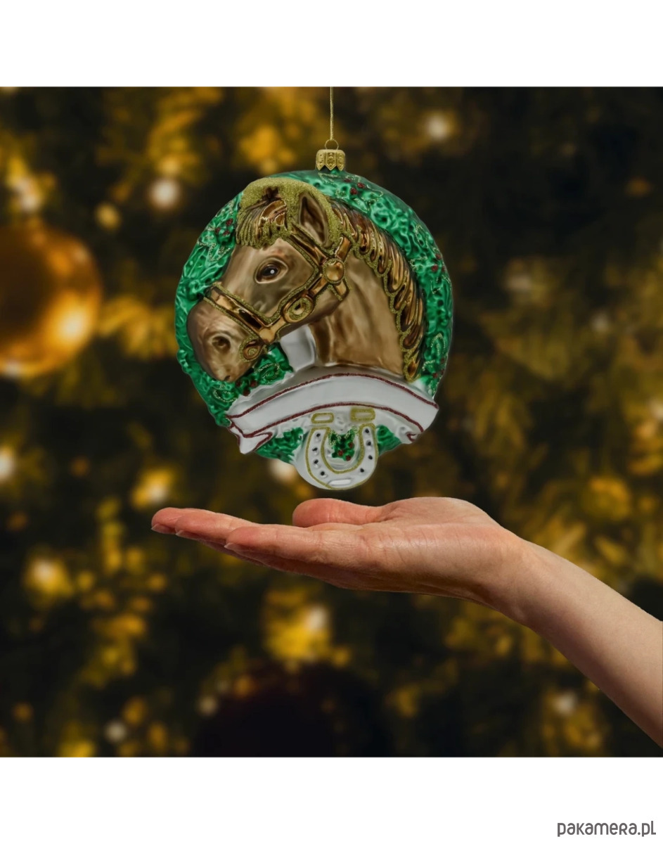 Wyjątkowa szklana bombka w formie dekoracyjnej zawieszki 3D z wizerunkiem konia – to prawdziwa gratka dla miłośników koni, stajni i wiejskiego klimatu świąt. Bombka została ręcznie formowana i malowana, a jej przestrzenny kształt przypomina klasyczny świąteczny wieniec z otworem z tyłu. Przód zdobi precyzyjnie odwzorowany koń o karmelowo-brązowym umaszczeniu, z realistycznymi detalami uprzęży, złotym brokatem oraz delikatnie błyszczącą grzywą. Całość otoczona jest świąteczną zielenią z motywem ostrokrzewu oraz symbolem szczęścia – złotą podkową.