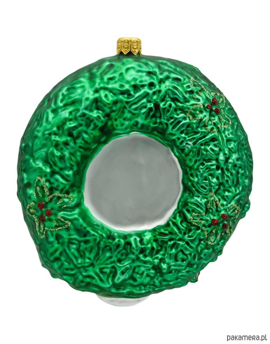 Tył bombki pozostaje estetycznie wykończony – zielony, matowy, z fakturą imitującą igliwie i drobnymi zdobieniami w postaci brokatowych liści ostrokrzewu. Taka forma daje dodatkowe możliwości aranżacyjne – bombka może pełnić funkcję dekoracji okiennej lub wiszącej ozdoby ściennej, nie tylko na choince.