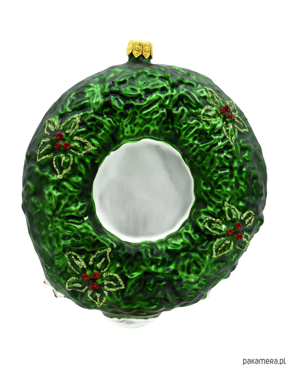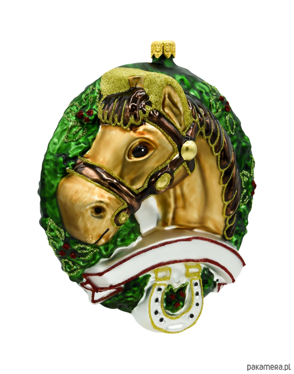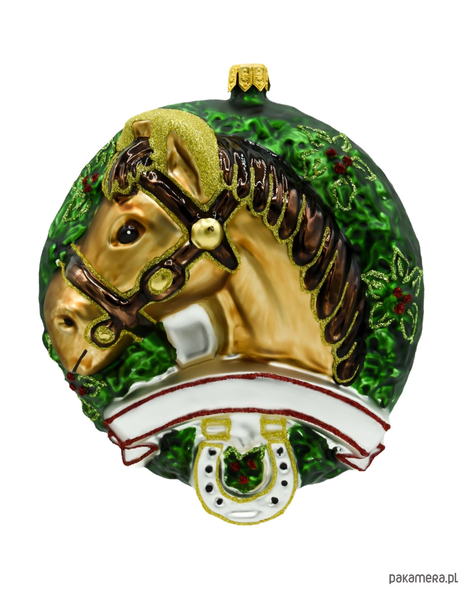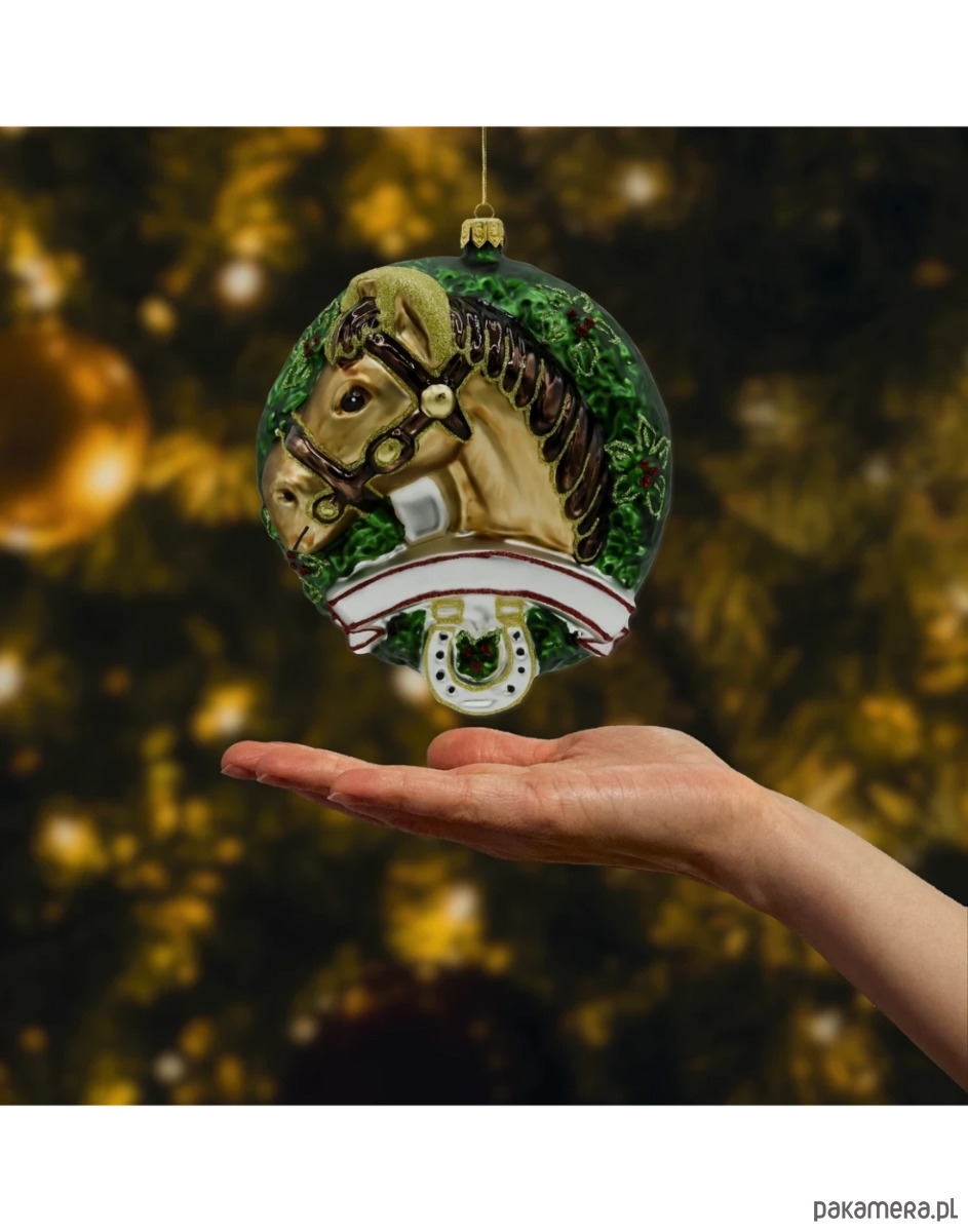 Wprowadź do swojej choinki odrobinę wiejskiego uroku i klasycznej elegancji dzięki tej wyjątkowej szklanej bombce w kształcie głowy konia otoczonego świątecznym wieńcem. Bombka przedstawia pięknie wymodelowanego konia w brązowym kantarze, z realistycznie oddanym spojrzeniem i precyzyjnym malowaniem grzywy. Całość dopełnia ciemnozielony wieniec z ostrokrzewem oraz ozdobna podkowa symbolizująca szczęście, umieszczona pod głową konia.
