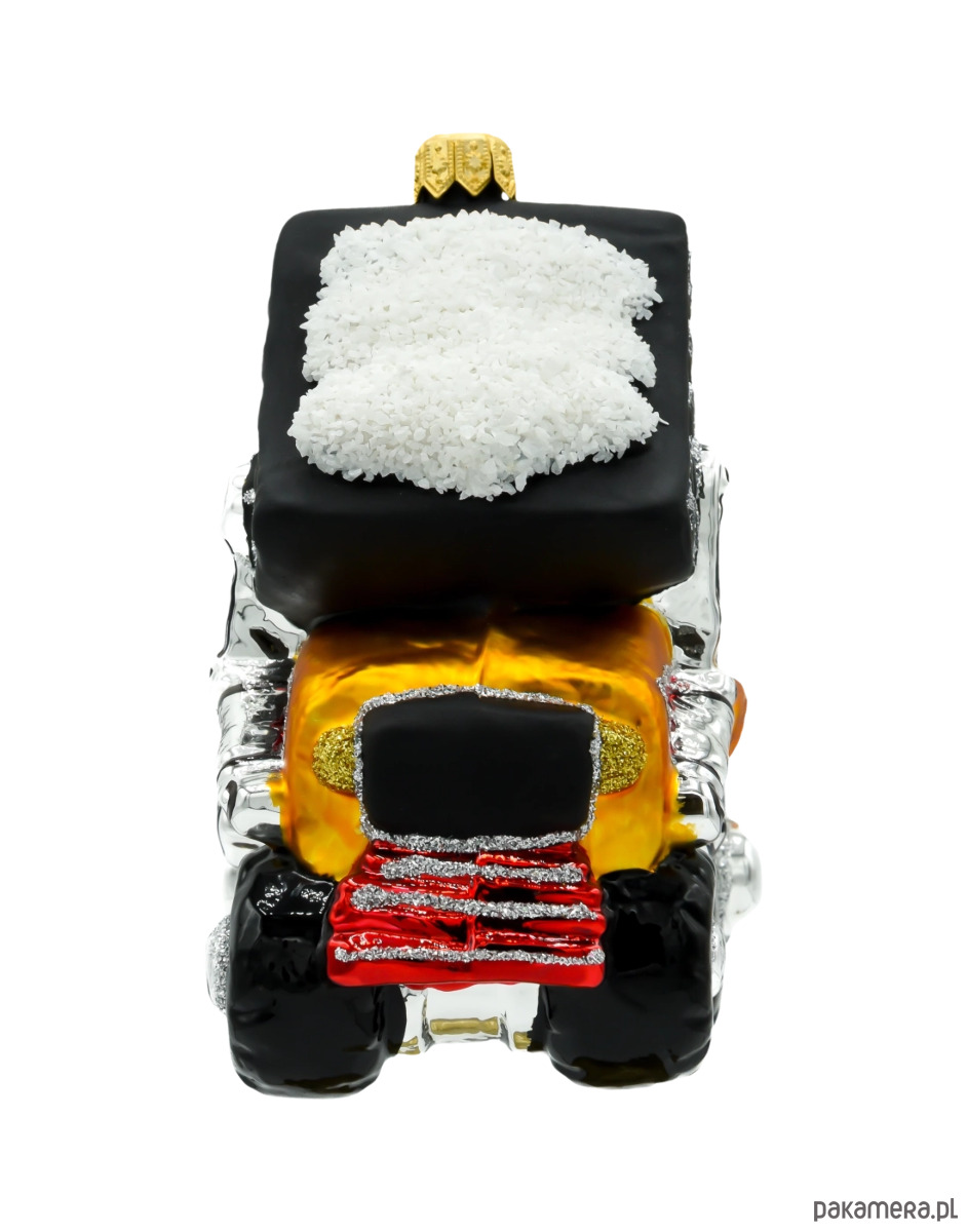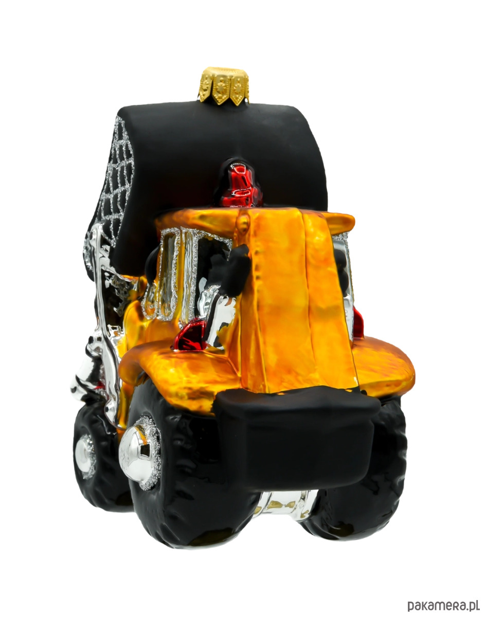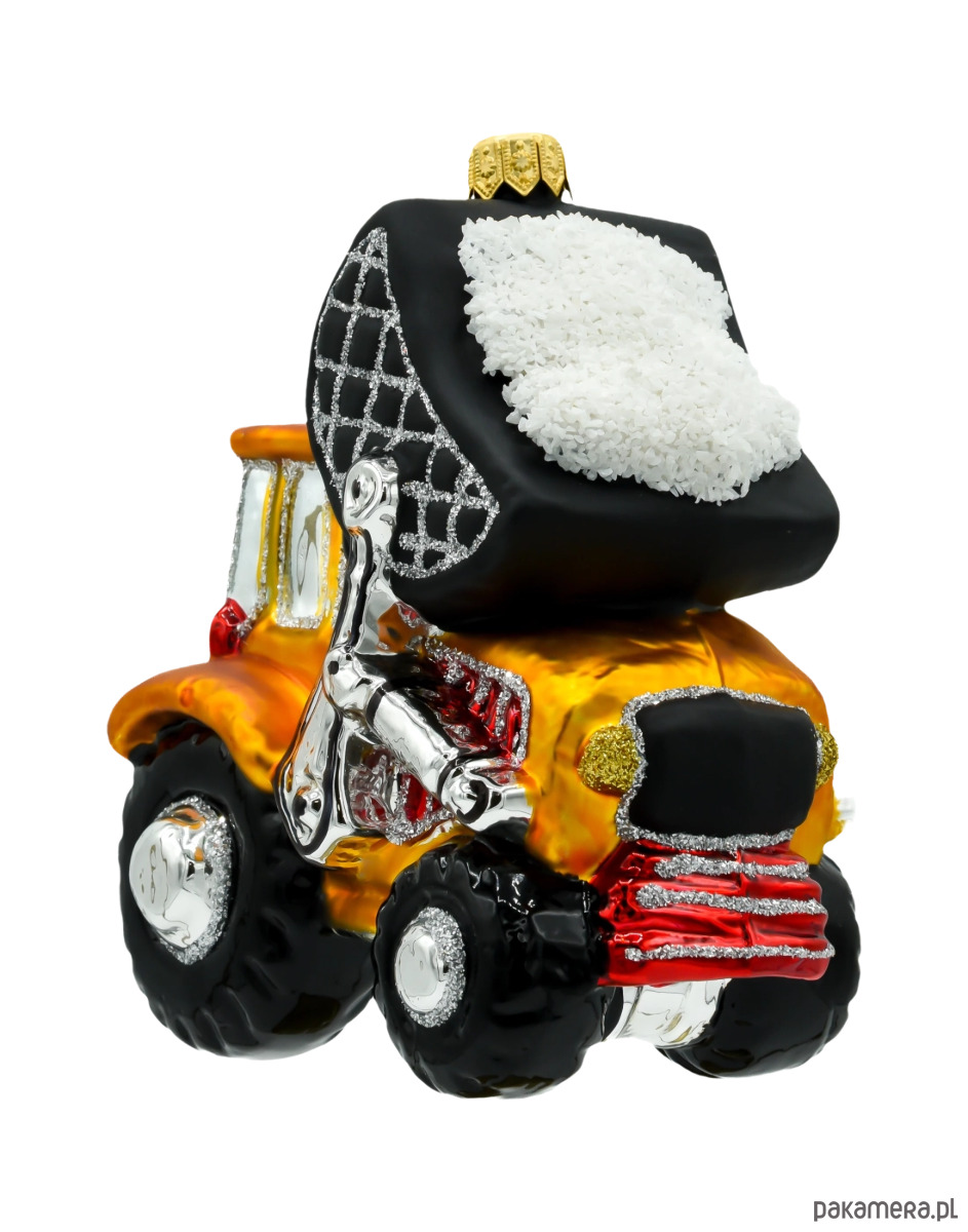 Bombka w kształcie koparki o złotym nadwoziu i detalach, takich jak srebrne ramię, brokatowe detale oraz charakterystyczne czarne koła, tworzy niezwykle realistyczną i przykuwającą wzrok ozdobę.