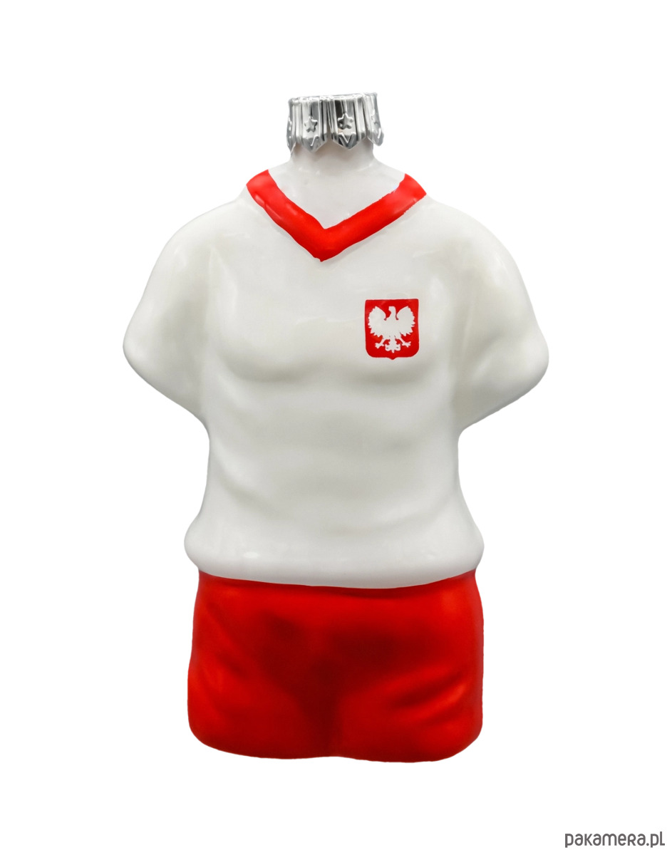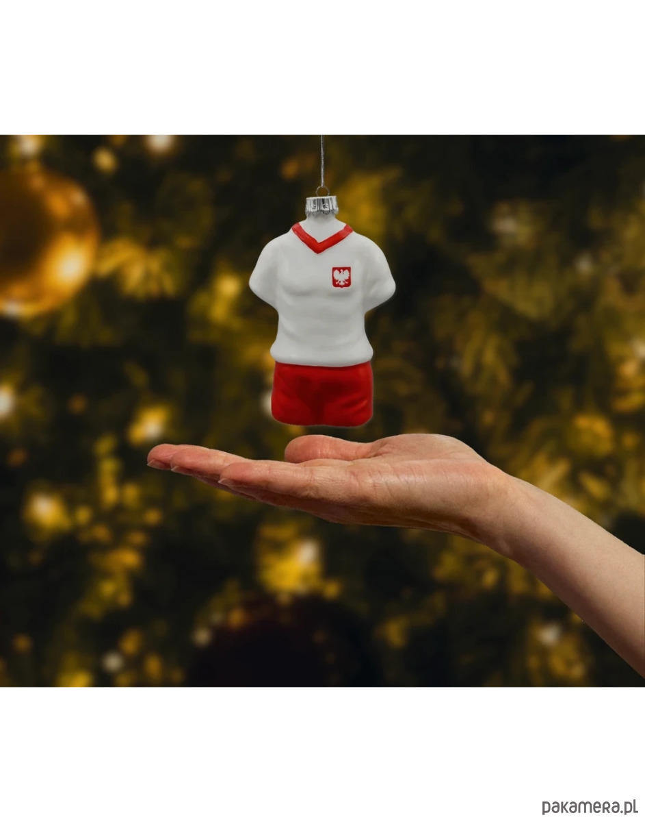 Dodaj do swojej choinki sportowego ducha i narodowej dumy dzięki wyjątkowej szklanej bombce w kształcie koszulki reprezentacji Polski. Ta starannie wykonana dekoracja przedstawia klasyczny biało-czerwony strój, z widocznym na piersi godłem Polski – białym orłem. To doskonały prezent dla każdego fana piłki nożnej i miłośnika świątecznych tradycji.