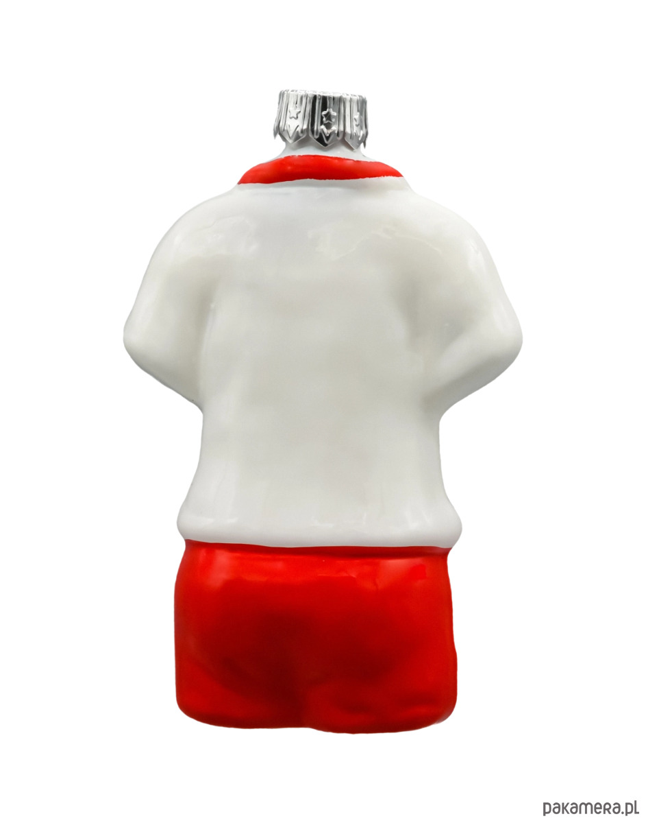 Bombka została ręcznie wykonana ze szkła dmuchanego, następnie ręcznie malowana z najwyższą precyzją, aby oddać detale sportowego stroju. Błyszcząca powierzchnia nadaje jej elegancki wygląd, a klasyczne zestawienie kolorystyczne idealnie wpisuje się w biało-czerwoną estetykę świątecznych dekoracji.