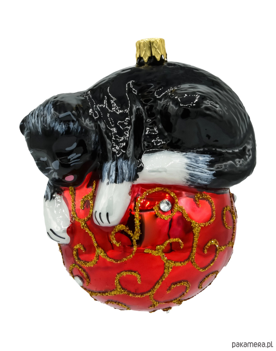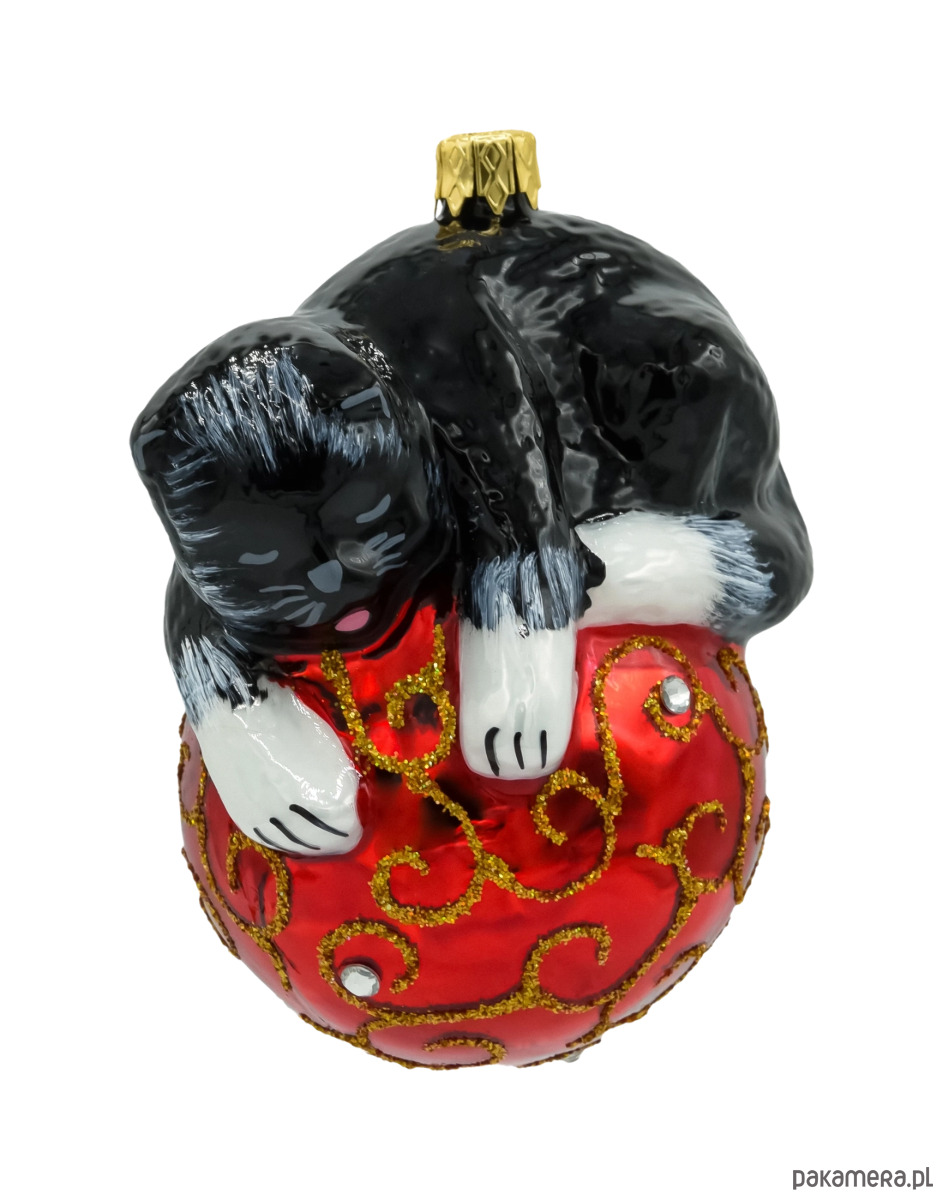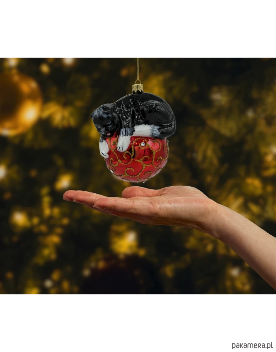 Szklana figurka przedstawia uroczego, białego kotka z szarymi łatkami, o wyrazistych oczach i różowym nosku. Kotek trzyma pod łapką brokatowy, zielony kłębek włóczki, co dodaje bombce uroku i charakterystycznego zwierzęcego akcentu. To dekoracja, która doskonale sprawdzi się zarówno na klasycznych, jak i nowoczesnych choinkach, a także jako prezent dla miłośników kotów, dzieci lub kolekcjonerów nietuzinkowych ozdób.