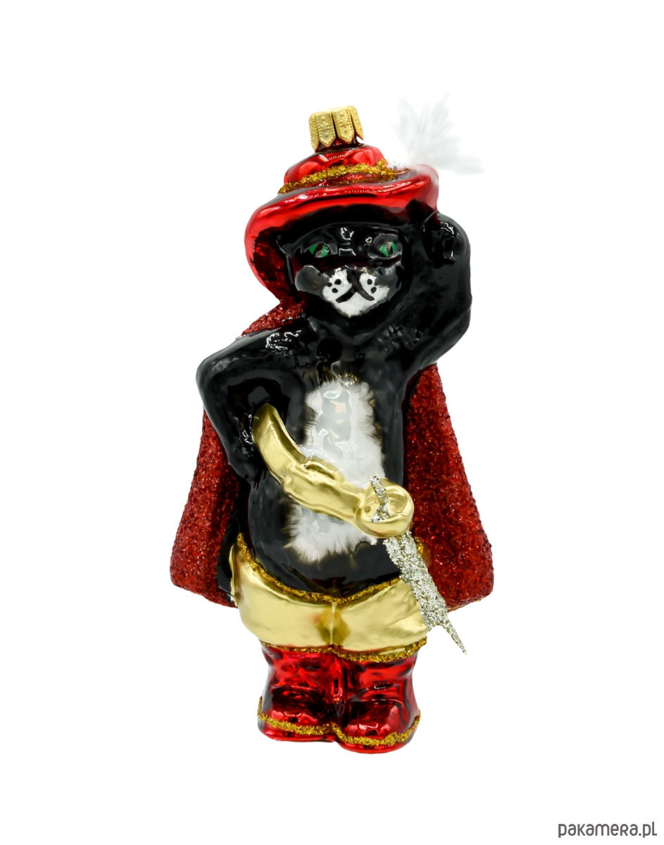 Bombka zachwyca kontrastem barw: głęboka czerń futra kota zestawiona została z intensywnie czerwoną peleryną i kapeluszem oraz złotymi butami i rękojeścią miecza.