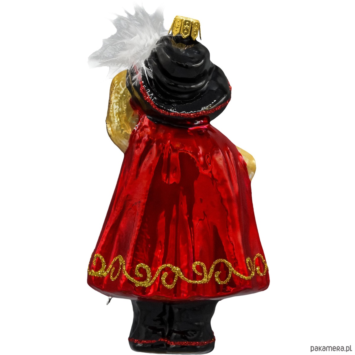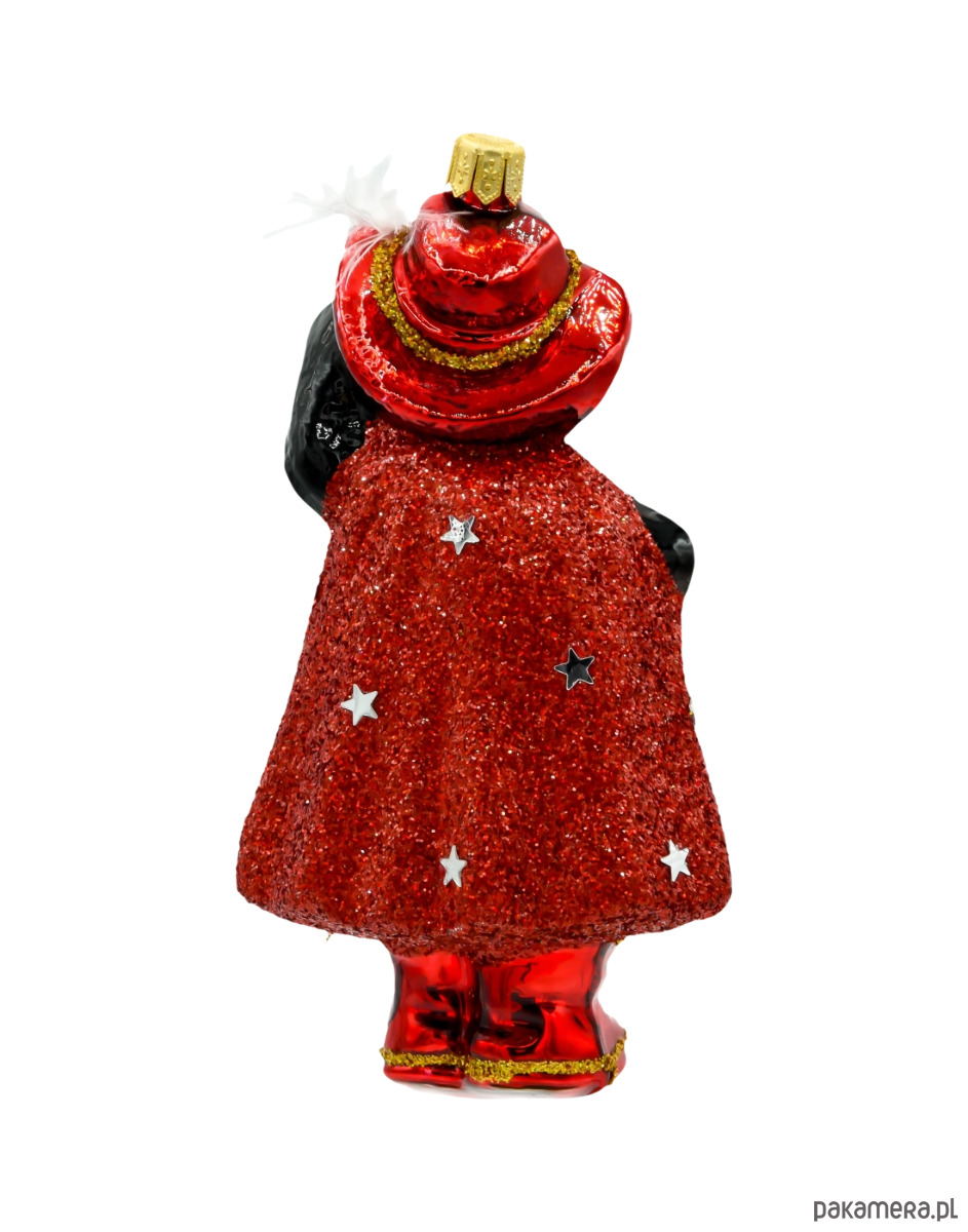 Brokatowe zdobienia na pelerynie i innych elementach stroju dodają ozdobie eleganckiego blasku, który pięknie mieni się w świetle choinkowych lampek.