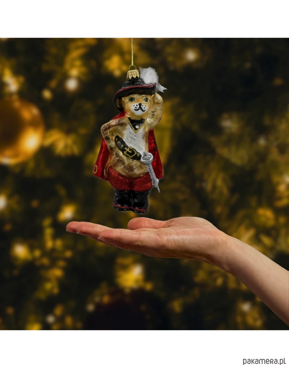 Wprowadź na swoją choinkę odrobinę bajkowej magii! Szklana bombka Kot w Butach to misternie wykonana, ręcznie dmuchana i ręcznie malowana ozdoba choinkowa, która zachwyca detalem: kapelusz z piórem, karminowa peleryna z łagodnym połyskiem, złote lamowania, pas z klamrą oraz połyskująca szabla. Figurkę wieńczy klasyczna, złota koronka do zawieszenia. To ozdoba świąteczna, która świetnie wygląda solo, a w zestawach buduje wyjątkową, bajkową aranżację drzewka.