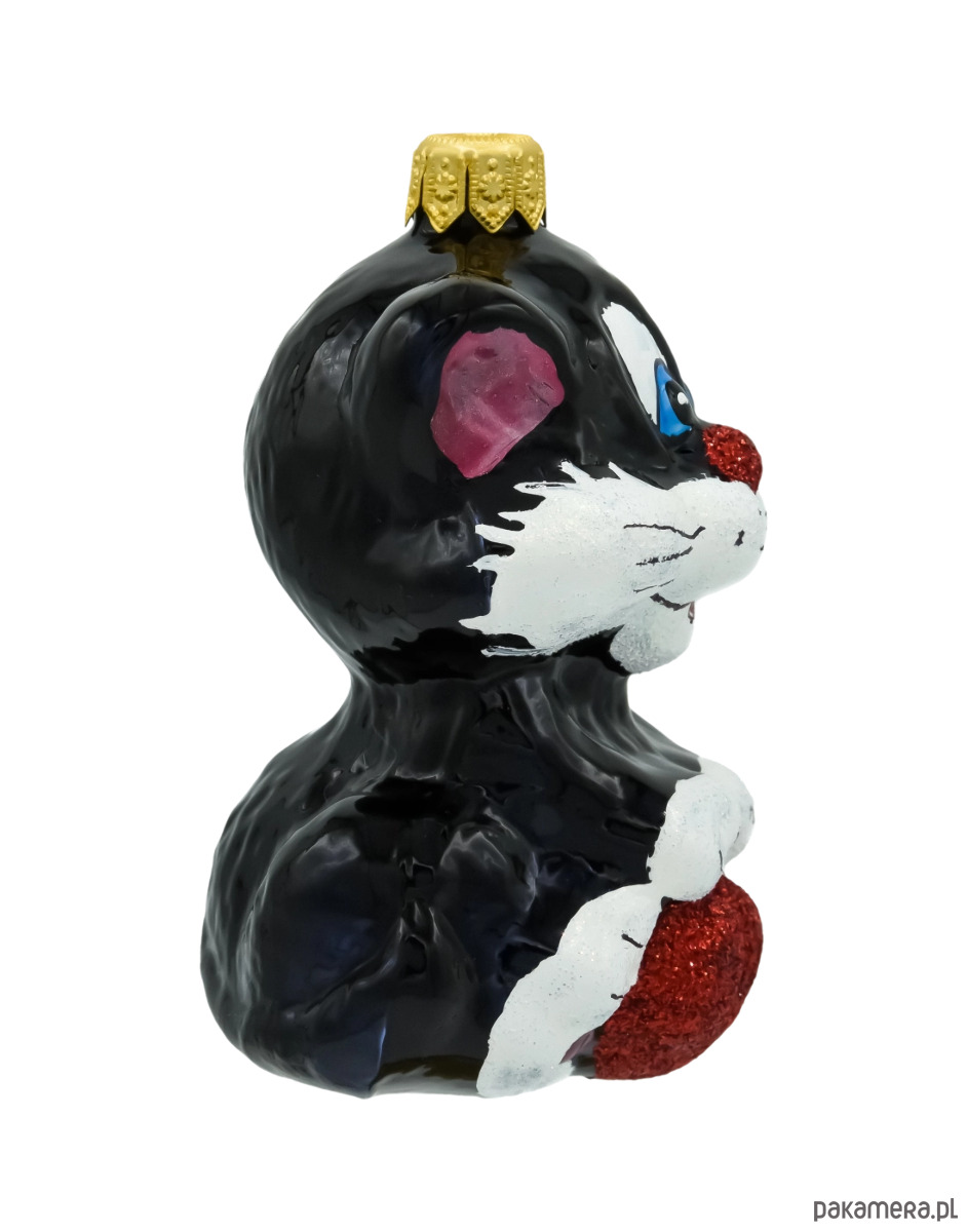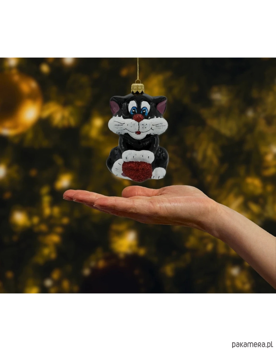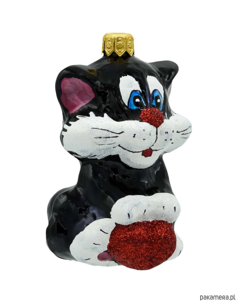 Szukasz bombki, która wywoła uśmiech i doda serca Twojej choince? Poznaj uroczego, czarnego kotka trzymającego czerwone, błyszczące serce – wyjątkową ozdobę choinkową, która łączy świąteczny urok z nutką walentynkowego romantyzmu. Ten ręcznie malowany kotek zachwyca wyrazistymi, niebieskimi oczami, uroczą czerwono-brokatową noską i futerkiem pełnym detali, które podkreślają jego figlarny, animowany wygląd.