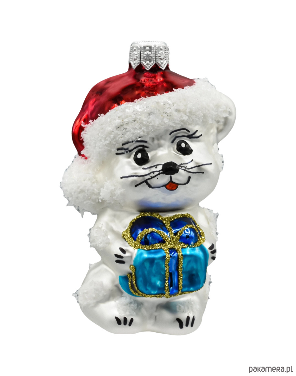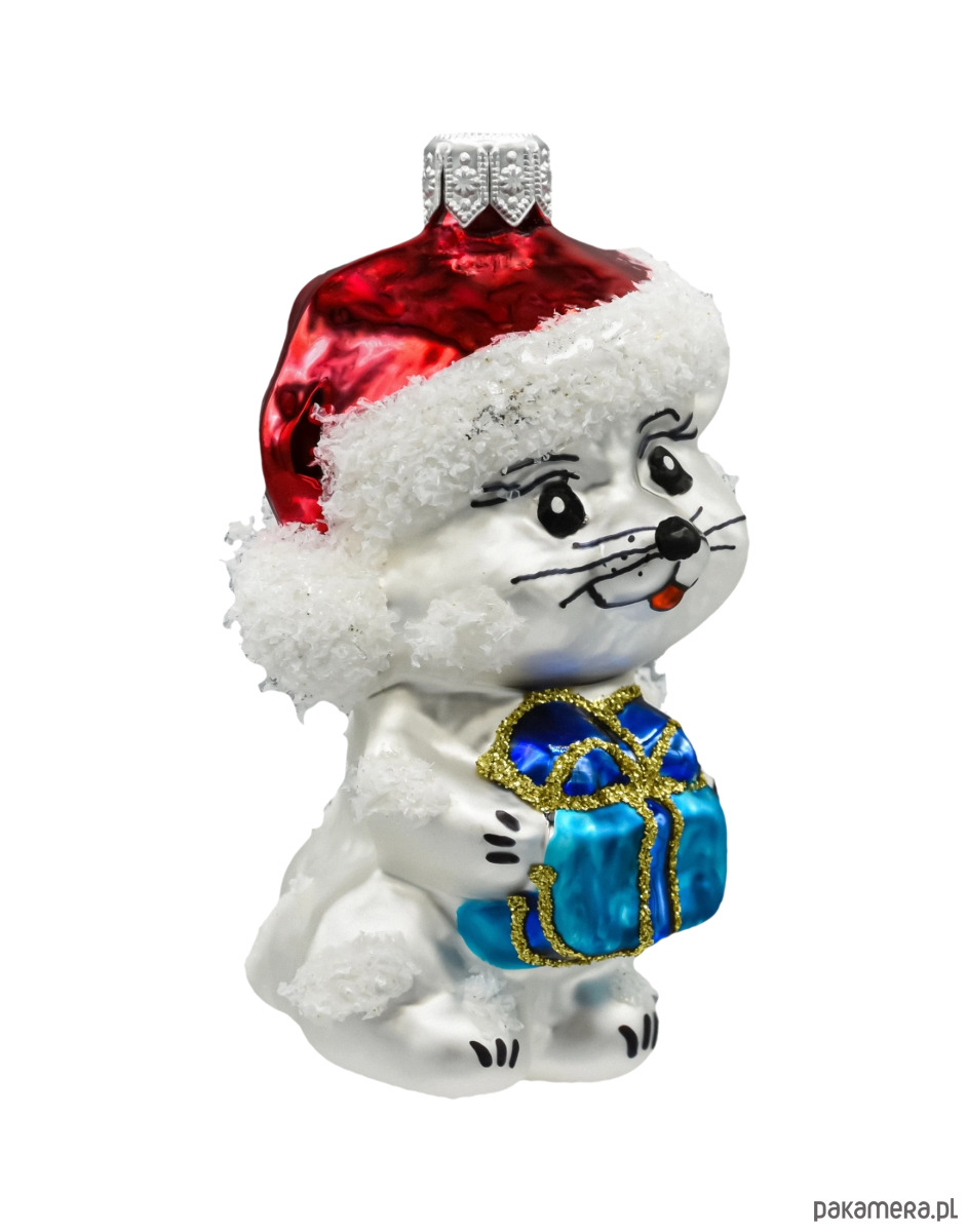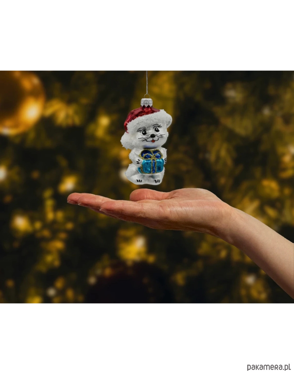 • Szklana bombka choinkowa w kształcie kotka z prezentem