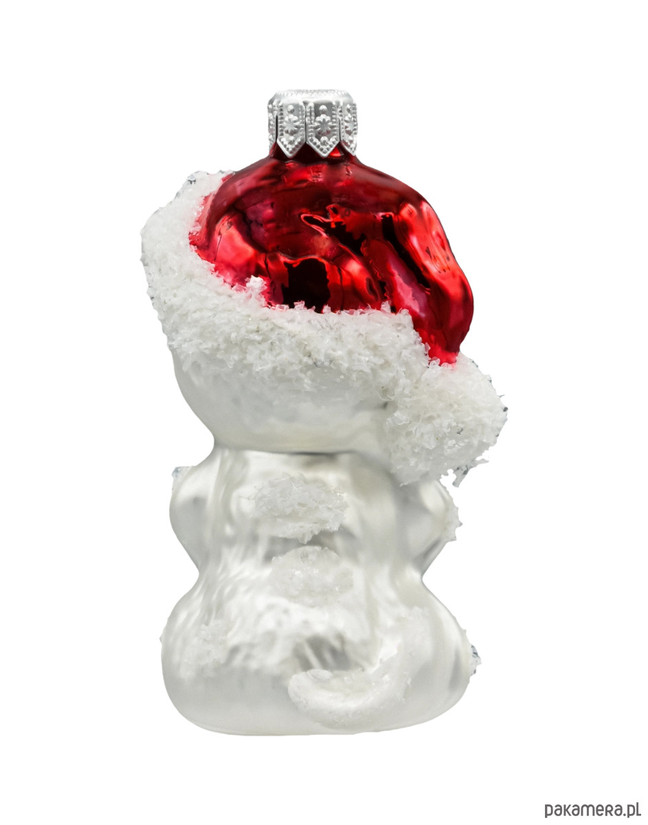Wprowadź do swojego świątecznego wnętrza odrobinę bajkowego uroku dzięki tej wyjątkowej szklanej bombce w kształcie uroczego kotka w stylu bożonarodzeniowym. Figurka została starannie wykonana ręcznie z dmuchanego szkła i przedstawia sympatyczne zwierzątko trzymające w łapkach połyskujący prezent w odcieniach błękitu i granatu, ozdobiony złotą brokatową kokardą. Na głowie foki znajduje się intensywnie czerwona czapka św. Mikołaja z efektownym białym obszyciem przypominającym świeży puch śniegu.