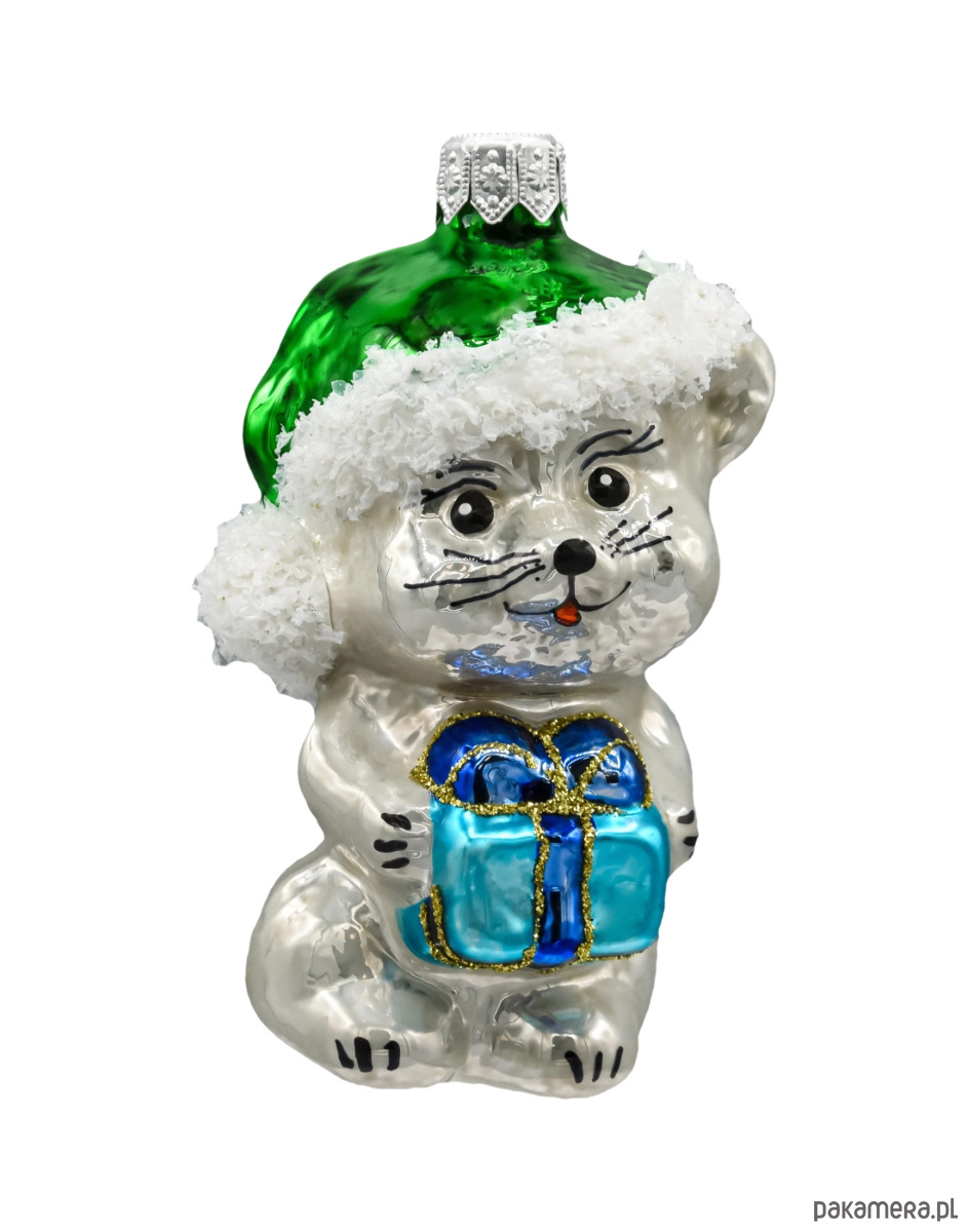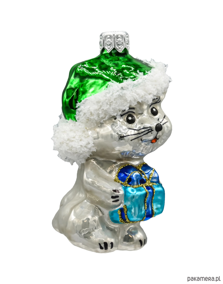 Szklana bombka choinkowa „Kotek Świąteczny z prezentem” to urocza ręcznie wykonana ozdoba świąteczna, która wprowadzi do wnętrza odrobinę magii i dziecięcej radości. Figurka przedstawia srebrzystą foczkę w zielonej, połyskującej czapce Mikołaja obszytej puszystym, białym futerkiem. W łapkach trzyma błękitno-niebieski prezent przewiązany złotą wstążką z brokatu, który mieni się w świetle choinkowych lampek.