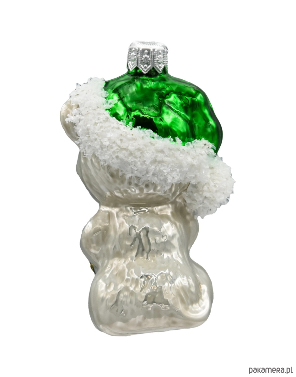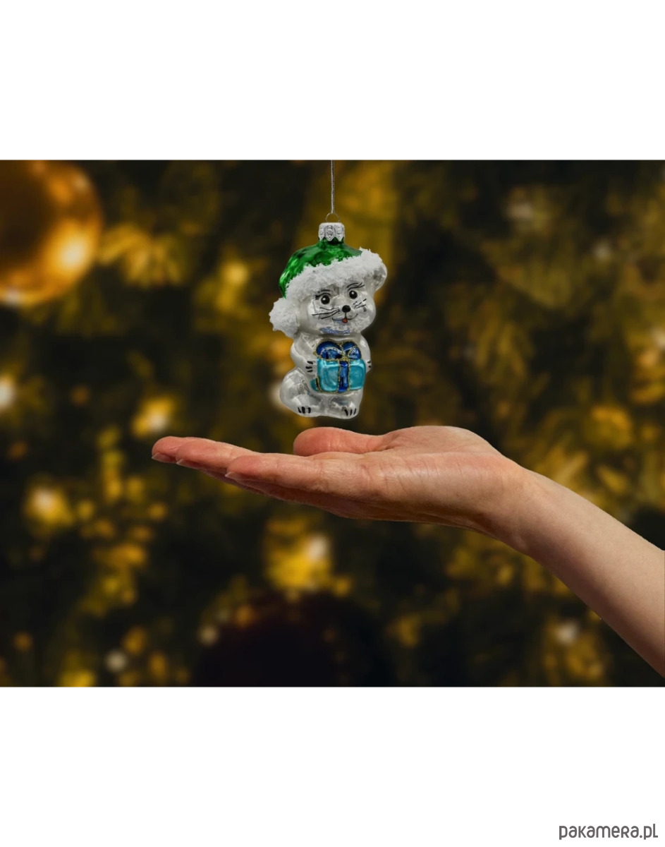 Bombka została wykonana z wysokiej jakości dmuchanego szkła i pokryta ręcznie naniesionymi detalami – od starannie namalowanych oczek i pyszczka, po realistyczne cieniowanie futerka. Dodatek sztucznego śniegu na czapce dodaje kompozycji zimowego uroku. Dzięki niewielkim rozmiarom i lekkiej formie bombka idealnie sprawdzi się zarówno na dużych choinkach, jak i w dekoracyjnych stroikach.