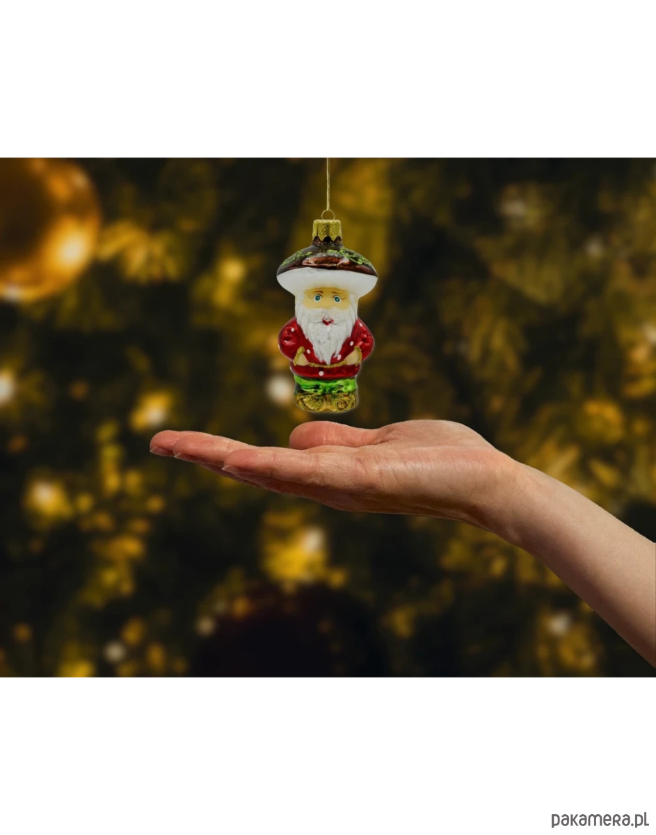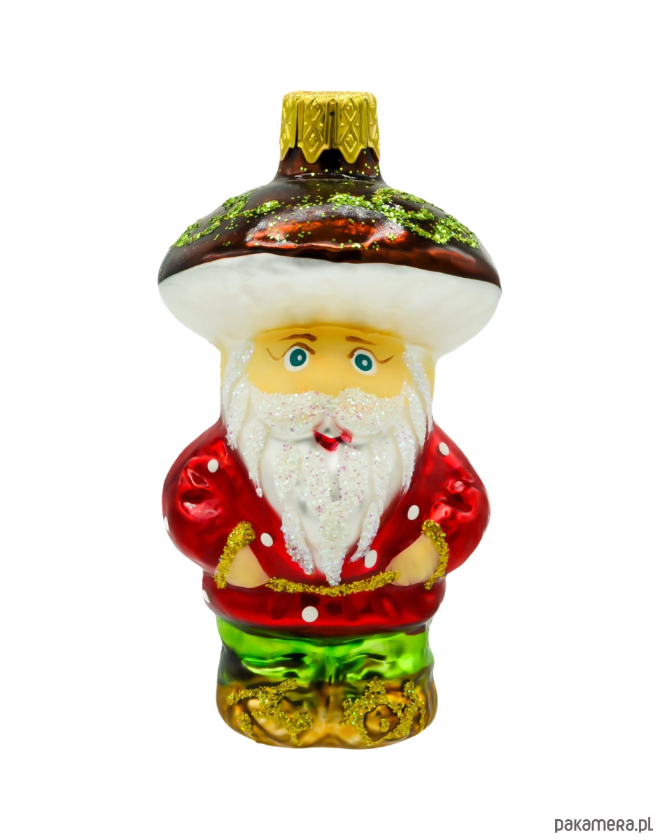 Wprowadź do swojej choinki odrobinę bajkowego klimatu dzięki tej niezwykłej bombce choinkowej w kształcie krasnala z grzybowym kapeluszem. Ręcznie wykonana ze szkła i misternie malowana, przedstawia sympatyczną postać z białą brodą, czerwonym kubraczkiem w białe grochy i wielkim kapeluszem przypominającym borowika lub prawdziwka, udekorowanym zielonym brokatem. To ozdoba, która zachwyci zarówno dzieci, jak i dorosłych.