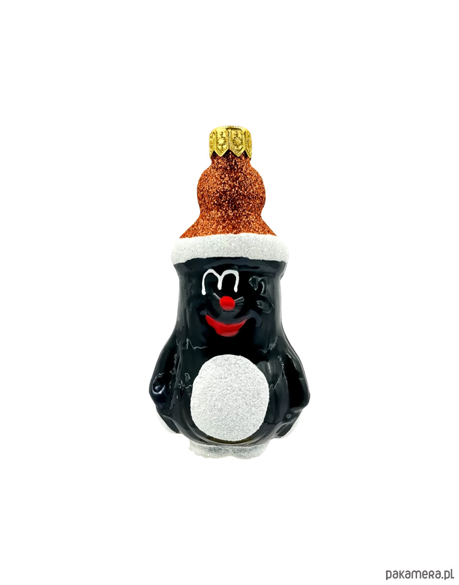 Kolorystyka: Głęboka czerń postaci krecika kontrastuje z jasnym, brokatowym wykończeniem czapki i detali. Intensywna czerwień nosa i uśmiechu dodaje całości radosnego akcentu, który idealnie wkomponuje się w świąteczny klimat.