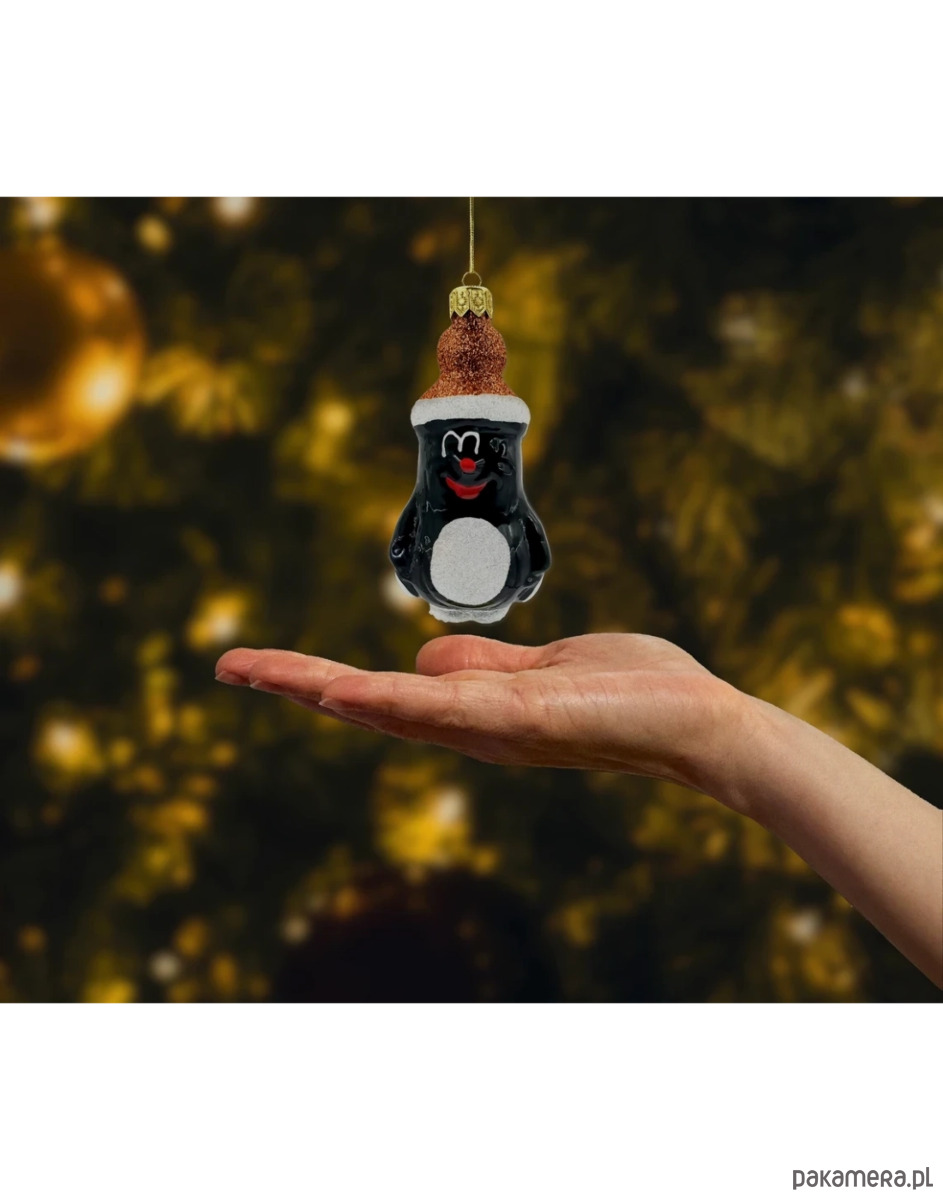 Motyw: Krecik z charakterystycznym uśmiechem, ubrany w efektowną, brokatową czapkę w kolorze ciepłego brązu, która pięknie połyskuje na tle choinkowych lampek. Białe akcenty wokół czapki i na brzuszku krecika dodają ozdobie świątecznego blasku i sprawiają, że nabiera ona jeszcze bardziej uroczystego charakteru.