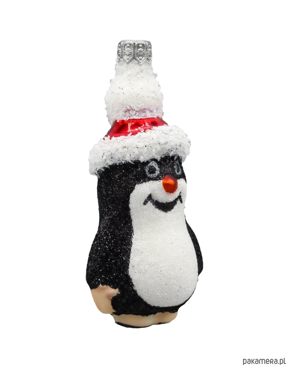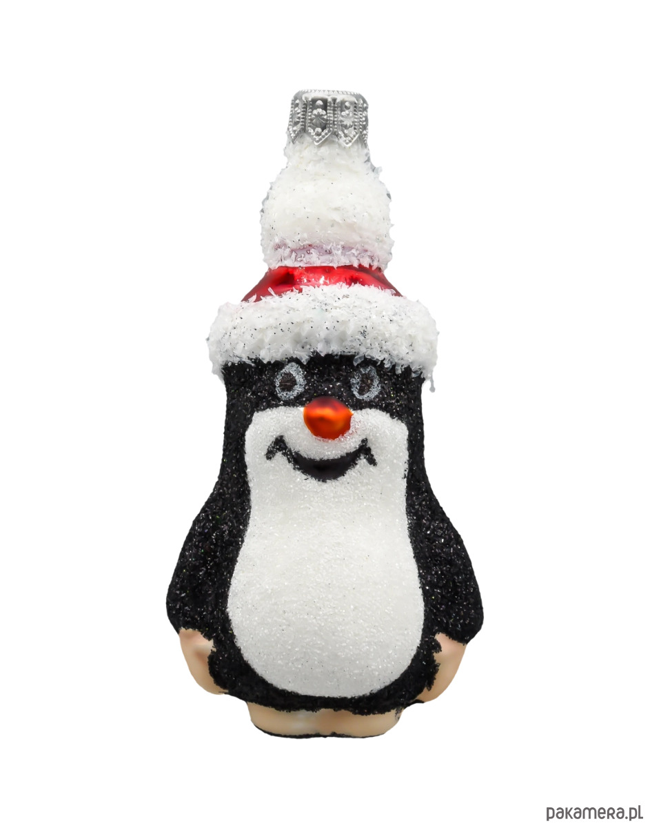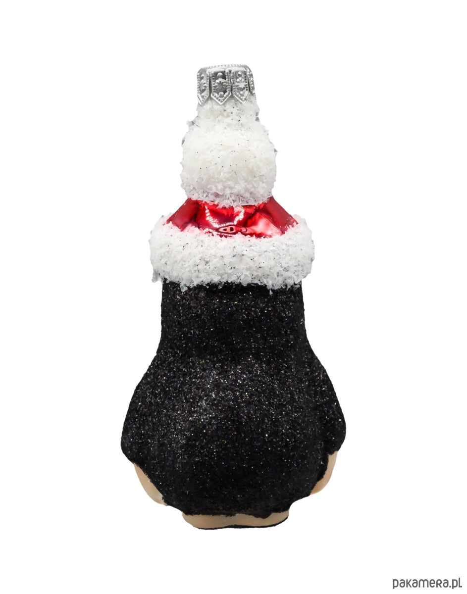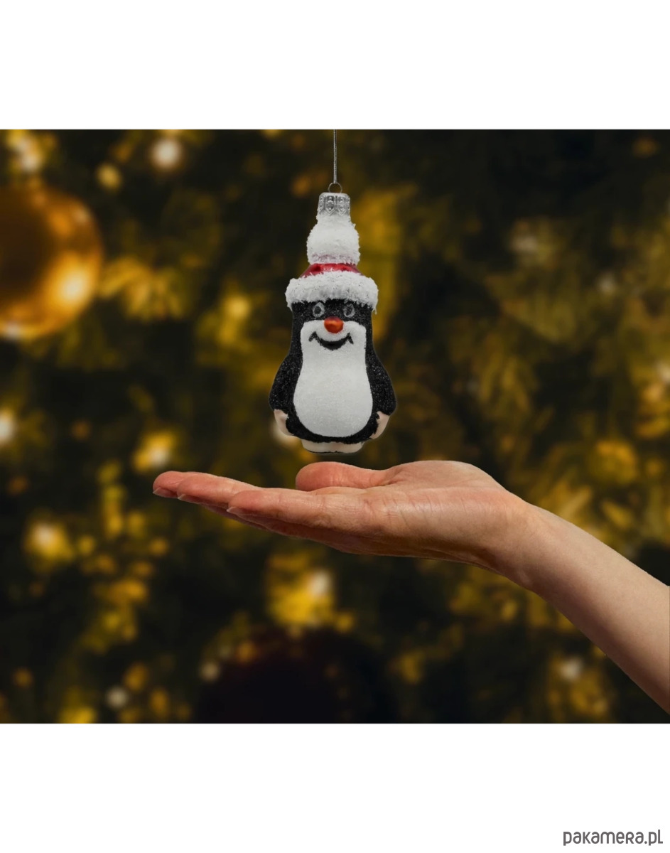 Szklana bombka choinkowa „Krecik w czapce Mikołaja” to urocza dekoracja świąteczna, która natychmiast przyciąga wzrok swoim ciepłem, humorem i zimowym klimatem. Przedstawia sympatycznego krecika o klasycznych czarno-białych barwach, ubranego w efektowną czapkę świętego Mikołaja pokrytą białym, iskrzącym się śniegiem. Cała figurka jest ręcznie zdobiona brokatem, który pięknie odbija światło choinkowych lampek, dodając blasku całej aranżacji świątecznej.