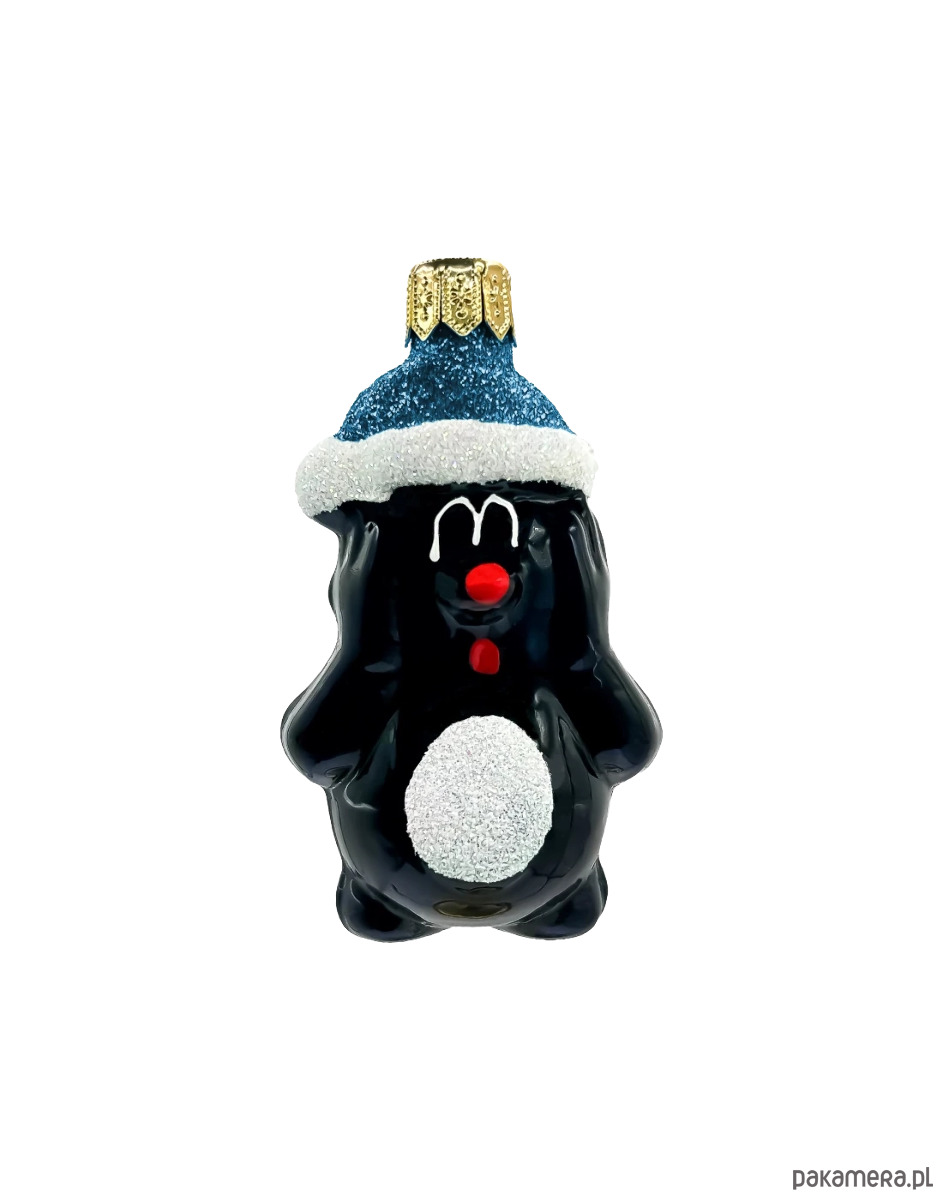 Kolorystyka: Intensywny czarny kolor krecika kontrastuje z jasnym, brokatowym wykończeniem czapki i białym brzuszkiem. Niebieska czapka, bogato zdobiona brokatem, sprawia, że bombka pięknie mieni się w świetle lampek choinkowych, tworząc magiczną atmosferę.
