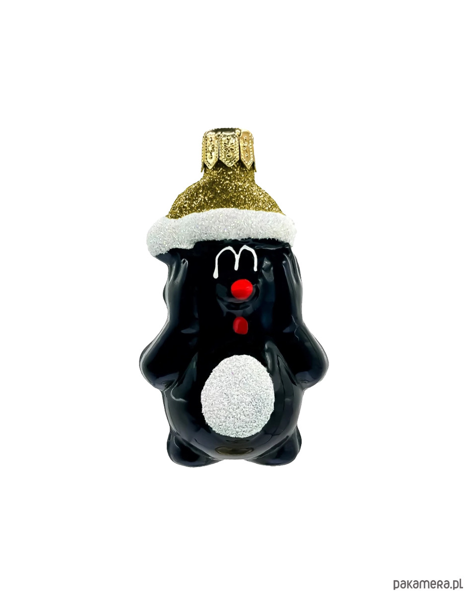 Kolorystyka: Lśniąca czerń krecika doskonale kontrastuje z mieniącą się złotą czapką, która pięknie odbija światło choinkowych lampek. Białe elementy, takie jak obszycie czapki i brzuszek, dodają elegancji, a czerwone detale wnoszą ciepło do zimowej atmosfery.