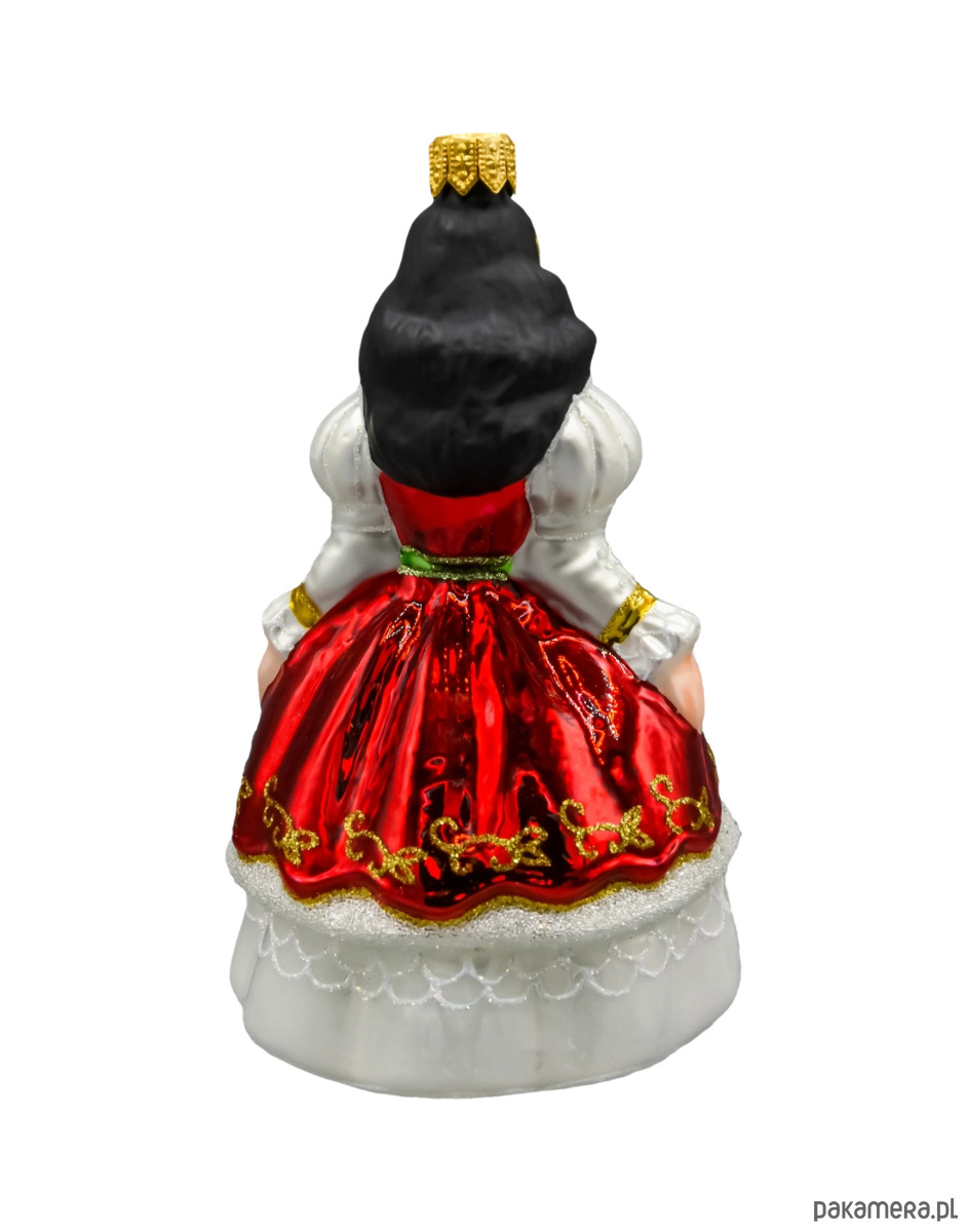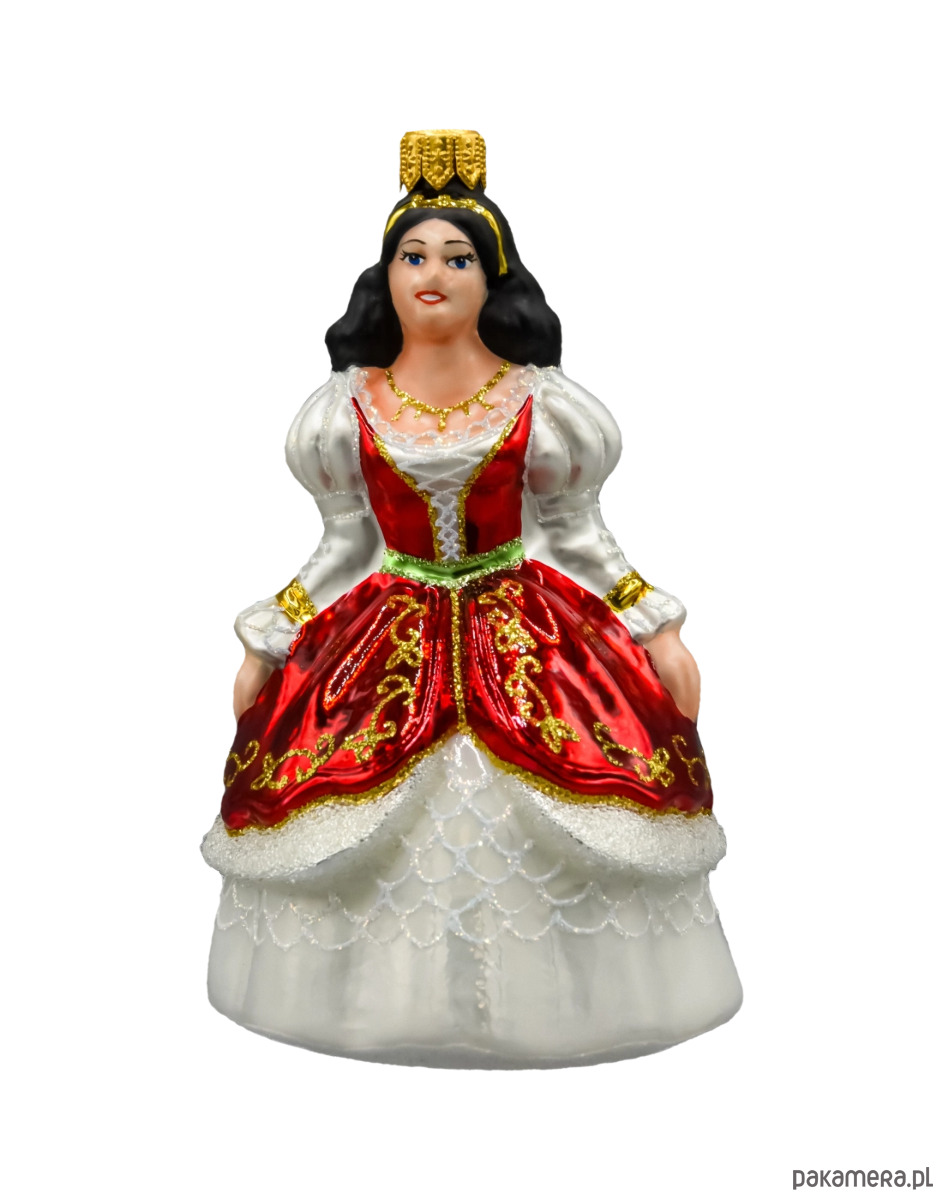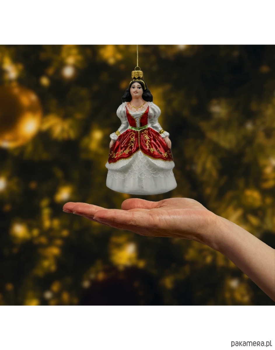 Ta szklana bombka w kształcie królewny to wyjątkowa ozdoba choinkowa, która wnosi do świątecznego wnętrza nutę baśniowej elegancji. Ręcznie malowana figura przedstawia postać królowej lub księżniczki w zachwycającej sukni balowej – czerwonej z bogato zdobionym, złotym ornamentem i kontrastującą białą spódnicą z efektem koronkowego haftu. Delikatne detale, takie jak złota korona, naszyjnik i bufiaste rękawy, dodają bombce wytwornego charakteru.