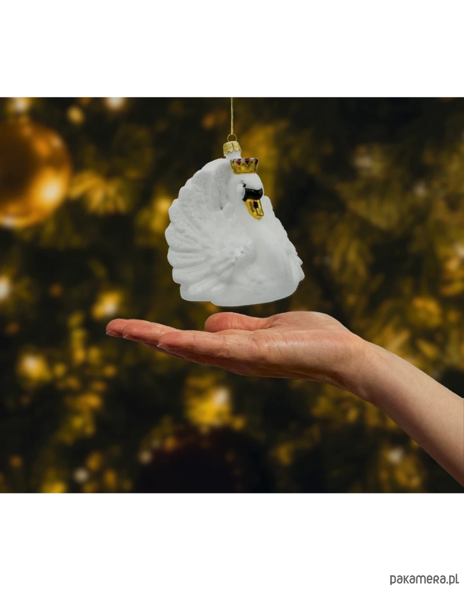Bombka „Łabędź z koroną” została wykonana z niezwykłą precyzją przez doświadczonych rzemieślników, co czyni ją prawdziwym dziełem sztuki. Każdy element, od starannie odwzorowanych piór pokrytych delikatnym brokatem, po szczegółowo zdobioną koronę, został wykonany ręcznie, co nadaje bombce unikalny charakter i niepowtarzalność. Biały kolor łabędzia symbolizuje czystość i elegancję, a jego subtelnie rozłożone skrzydła tworzą wrażenie lekkości i gracji. Brokatowe akcenty i połyskująca korona sprawiają, że bombka pięknie odbija światło, dodając choinkowej aranżacji blasku i wyrafinowania.