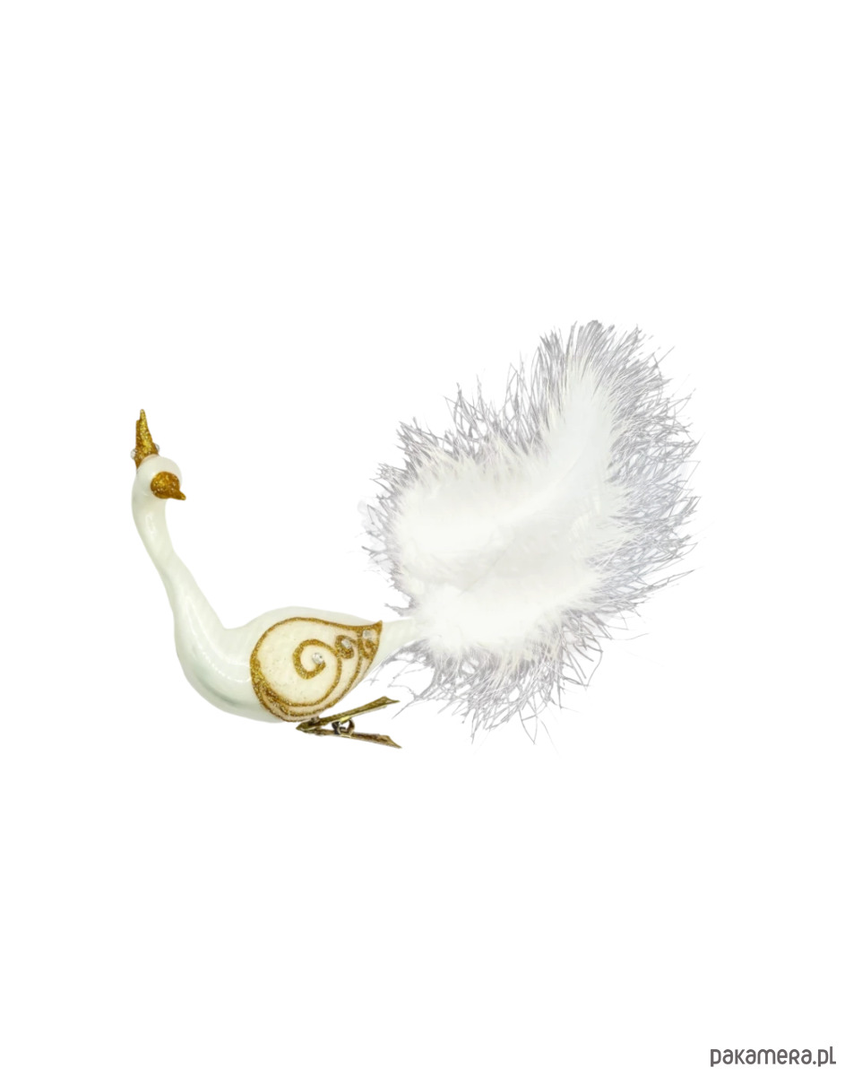 Majestatyczny ogon wykonany z białych, puszystych piór przyciąga uwagę swoją lekkością i naturalnym pięknem. Pióra subtelnie mienią się w świetle, nadając bombce wyjątkowego blasku.