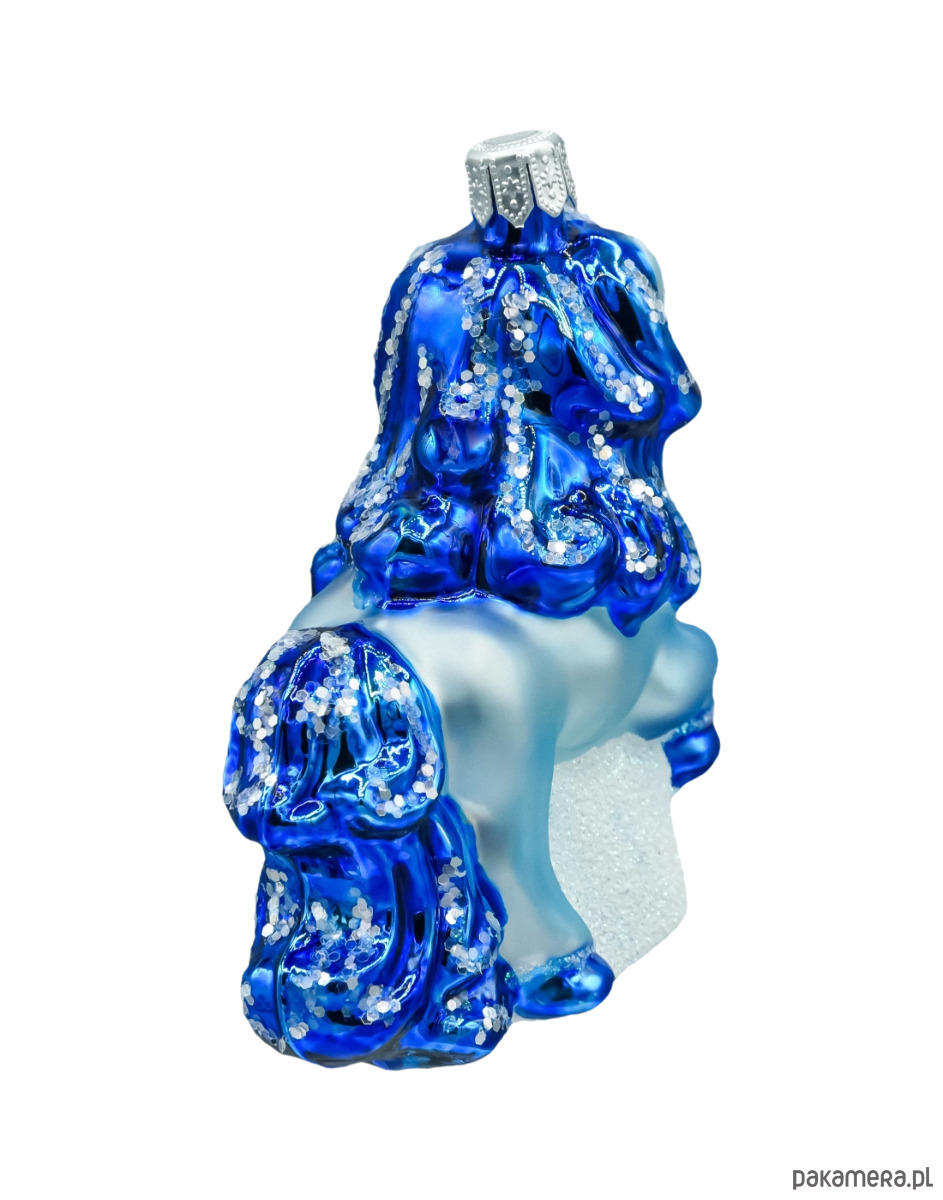 Wytworna, ręcznie malowana bombka szklana w kształcie uroczego kucyka. Delikatnie perłowe, błękitno-srebrne szkło zestawiono z głębokim kobaltem grzywy i ogona, podkreślonym drobnym, srebrzystym brokatem. Figurka ma duże, przyjazne oczy, podniesioną przednią nóżkę i dekoracyjne „kopytka”, dzięki czemu na choince wygląda jak mały, bajkowy rumak. To efektowna ozdoba choinkowa z kategorii bombki szklane figurki – idealna do aranżacji w stylu baśniowym, dziecięcym, glamour lub retro.