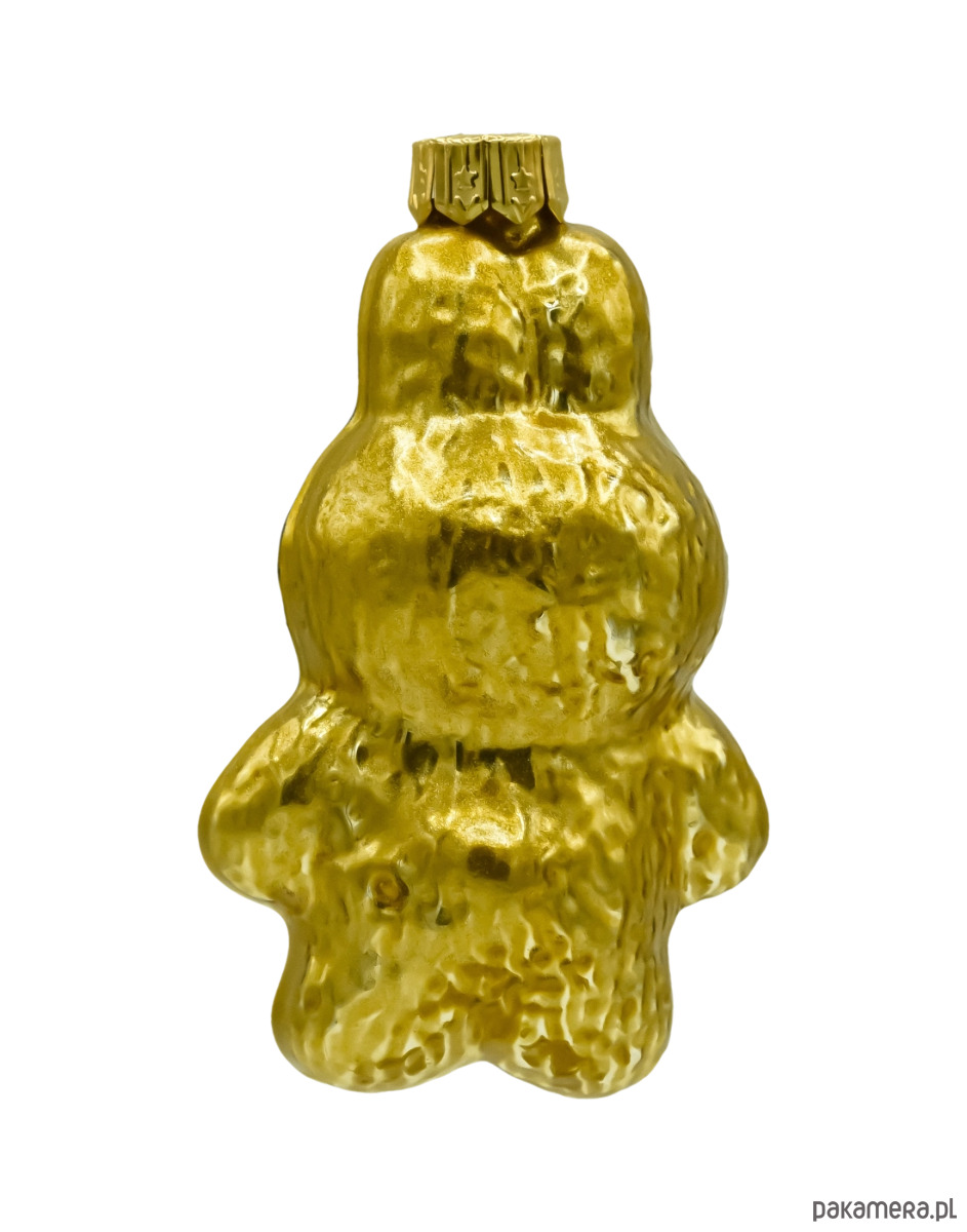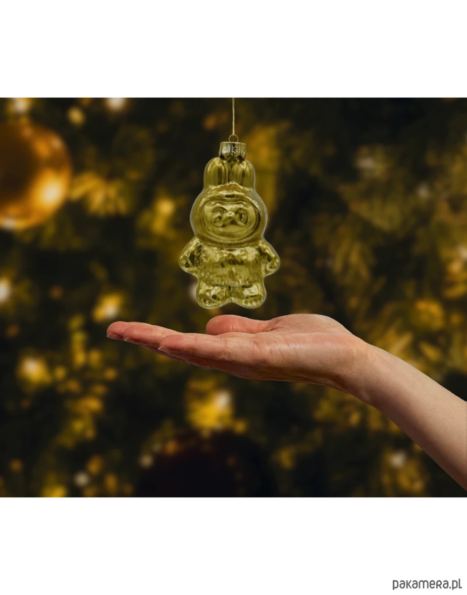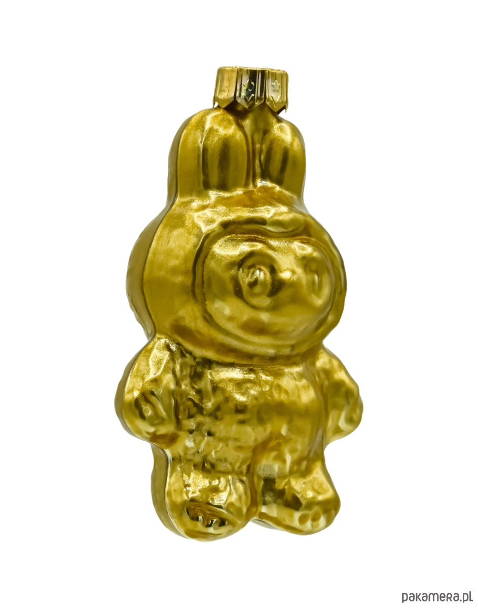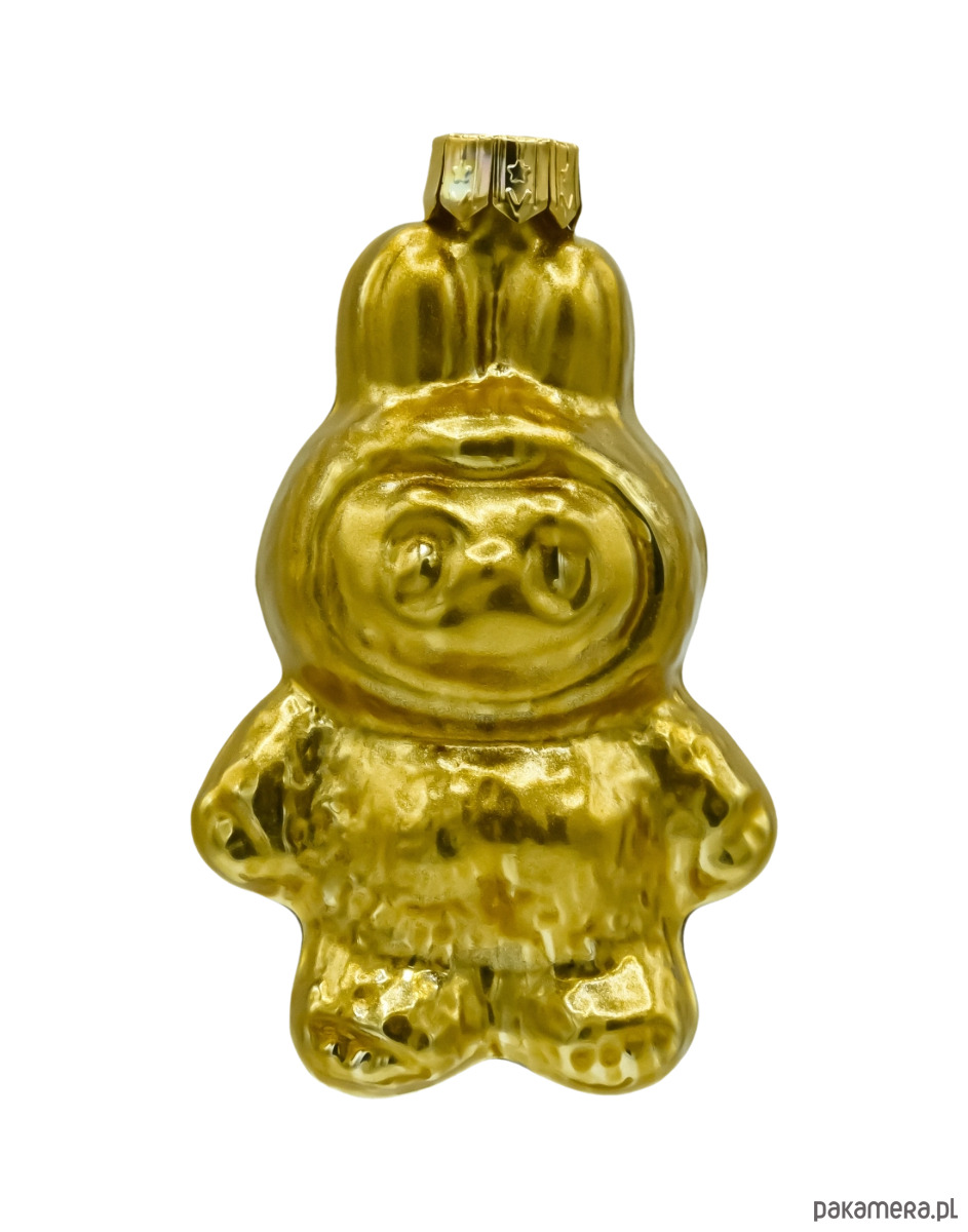 Figuralna bombka szklana inspirowana postacią Labubu – w całości wykończona metalizowanym złotem. To lekka, dmuchana ozdoba o nowoczesnym charakterze: z króliczymi uszkami, zaokrągloną sylwetką i miękkim modelowaniem detali. Lustrzana, złota powierzchnia pięknie odbija światło lampek, dzięki czemu bombka błyszczy na choince i dodaje aranżacji elegancji w stylu glamour.