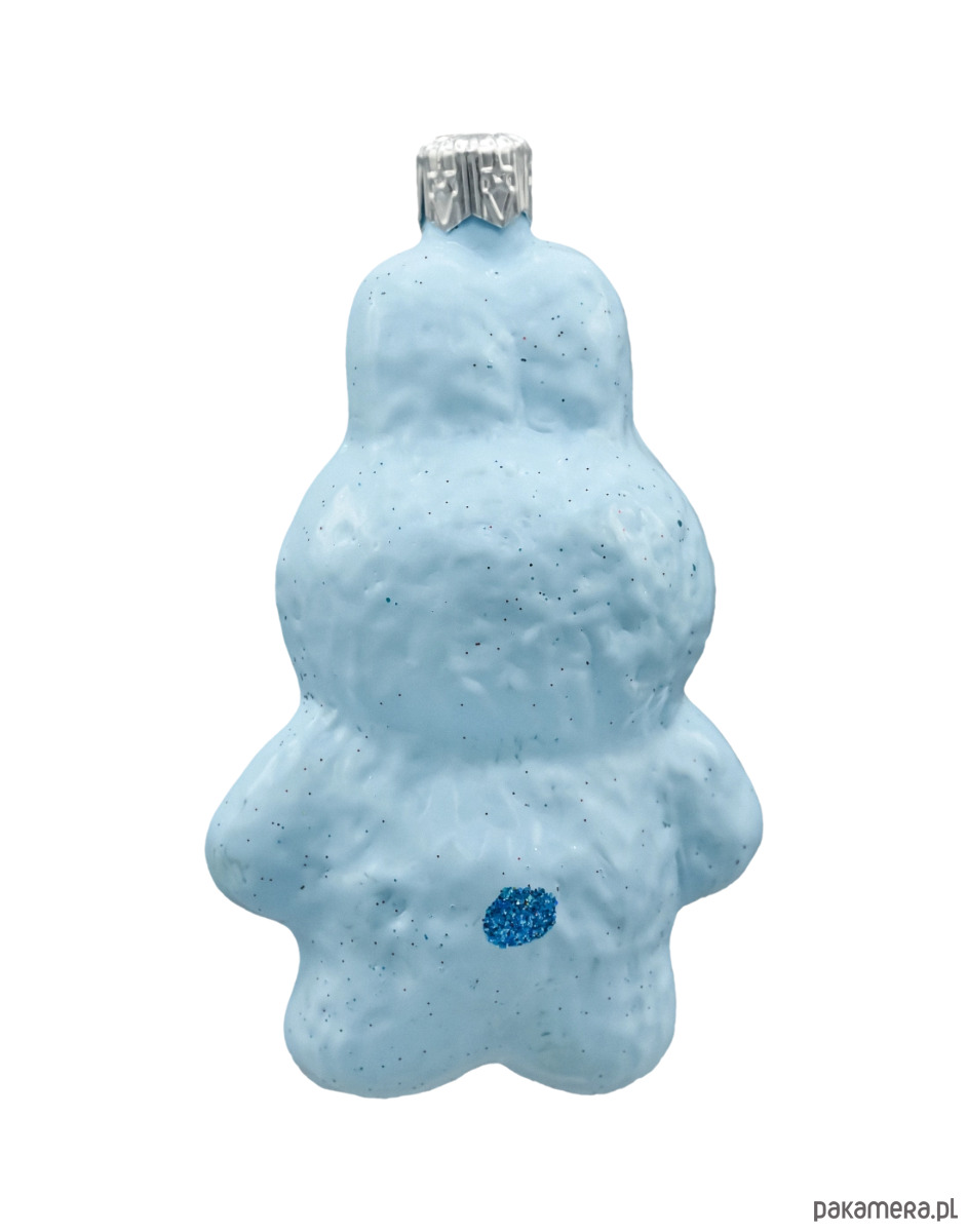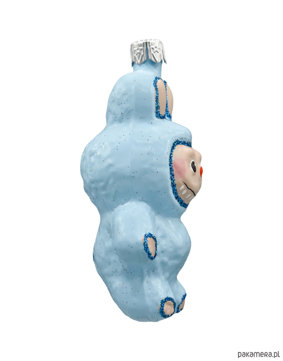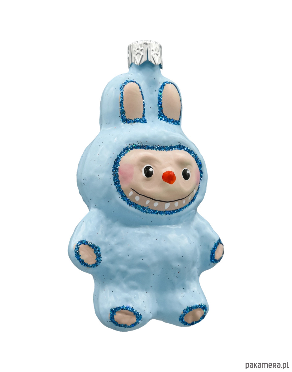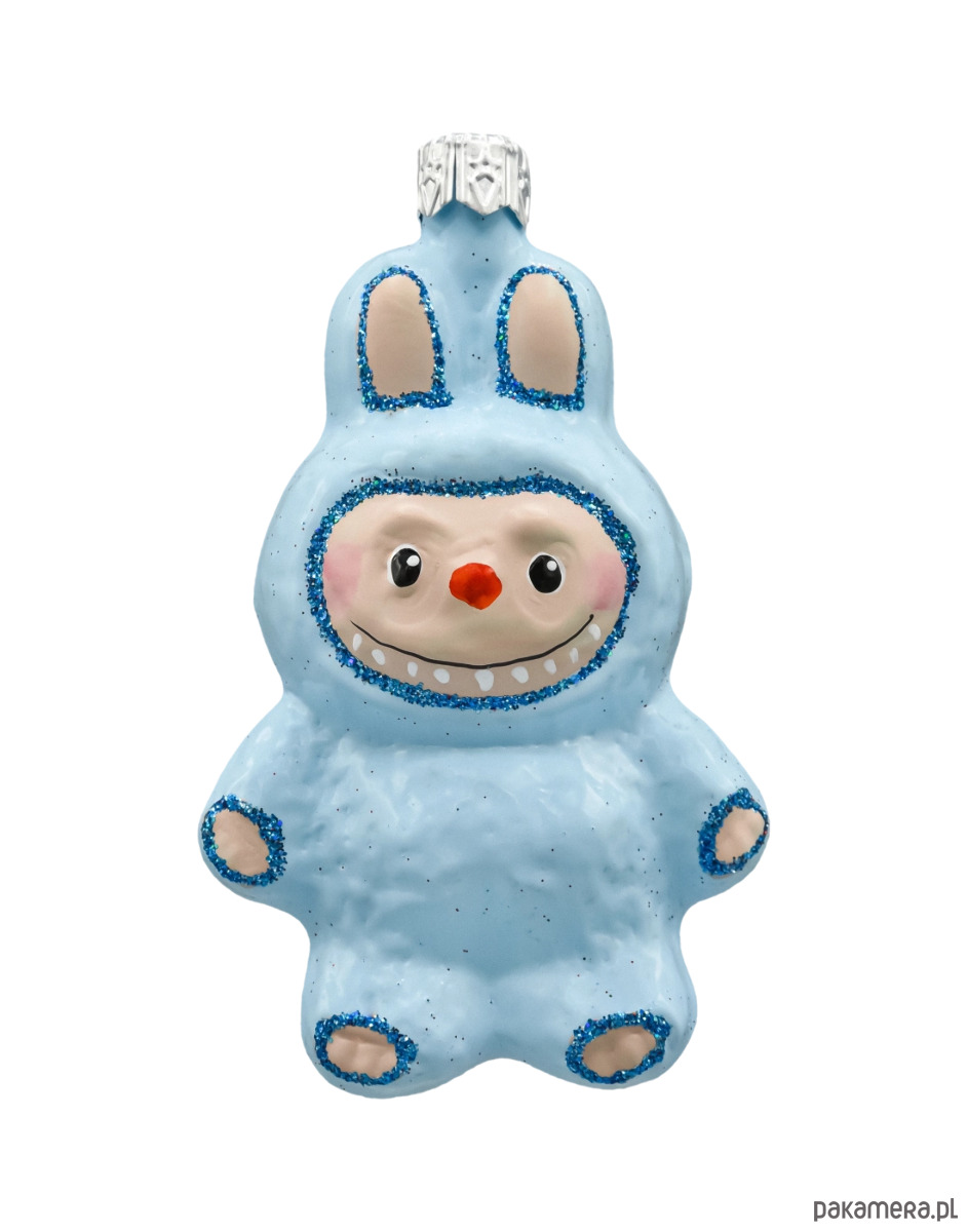 Urocza bombka choinkowa w stylu labubu – pastelowy błękitny stworek z króliczymi uszami, szerokim uśmiechem i piegowatym, połyskującym kombinezonem. Figurkę wykonano ze szkła dmuchanego i wykończono ręcznie: twarz modelowana pędzlem, nos jak koralik marchewki, a krawędzie pyszczka, uszu i łapek obsypano niebieskim, iskrzącym brokatem. Delikatny satynowy połysk i srebrna czapeczka z oczkiem sprawiają, że dekor świetnie mieni się w świetle lampek. To idealna bombka figurka handmade dla fanów estetyki kawaii/labubu, dzieci i kolekcjonerów nietuzinkowych ozdób.
