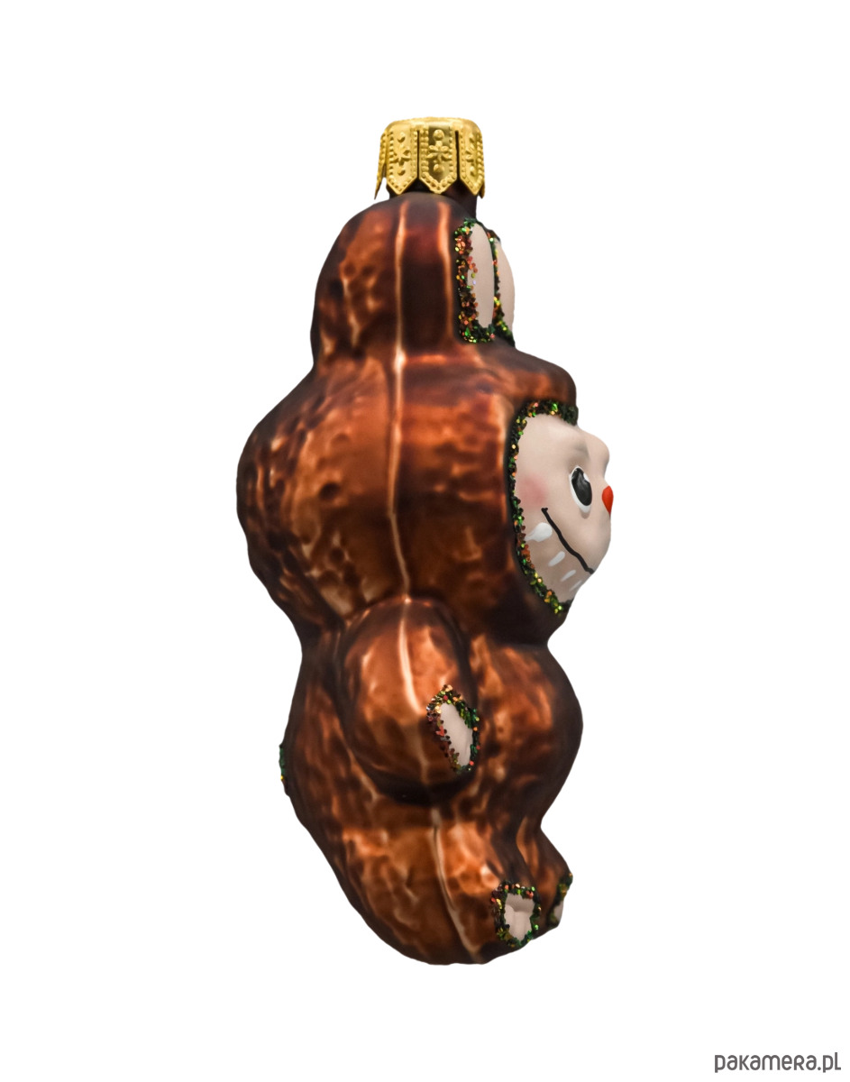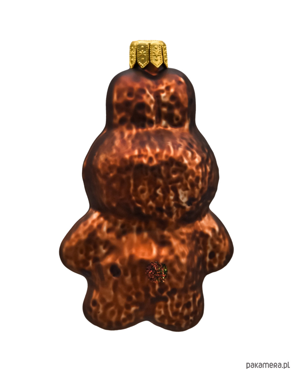 Zabawna, kolekcjonerska bombka choinkowa w stylu labubu – szklana figurka króliczka z szerokim uśmiechem i czerwonym noskiem. Korpus ma efektowne, miedziano-brązowe wykończenie o delikatnej, „młotkowanej” fakturze, które pięknie łapie światło lampek. Kontury pyszczka, uszu i „łapek” podkreślono wielokolorowym, holograficznym brokatem, a całość wieńczy złota czapeczka z oczkiem do zawieszenia. Bombka została dmuchana ustnie do formy i ręcznie malowana, dlatego każda sztuka jest unikatowa – idealna do nowoczesnych i pop-kulturowych aranżacji świątecznych.