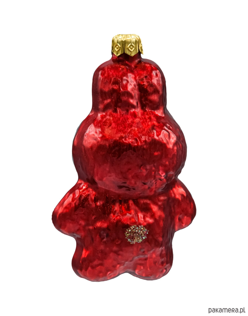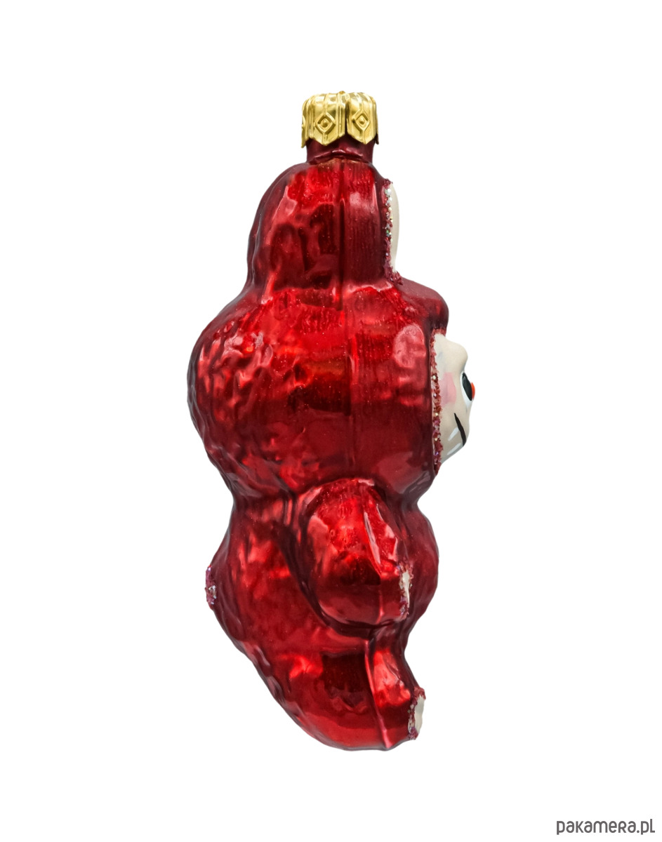 Przyciągająca wzrok, ręcznie malowana bombka choinkowa w kształcie uśmiechniętej postaci inspirowanej Labubu. Intensywnie czerwony, perłowy strój z połyskiem podkreślono drobnym brokatem w odcieniach złota i różu, a twarz z charakterystycznym noskiem i zaznaczonym uśmiechem nadaje ozdobie ciepły, bajkowy charakter. Figurka została wykonana ze szkła i wykończona metalową, złotą koronką z oczkiem do zawieszenia. To świetny akcent do nowoczesnych i klasycznych aranżacji – od choinki w salonie, przez świąteczną gałązkę, po półkę z kolekcją figurek. Oryginalna „bombka figurka” zachwyci fanów stylu Kawaii i wszystkich, którzy szukają niebanalnych, kolekcjonerskich ozdób świątecznych.