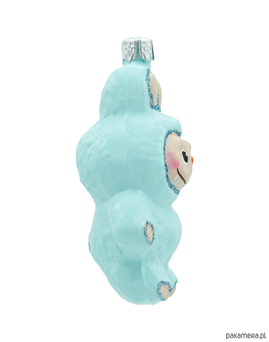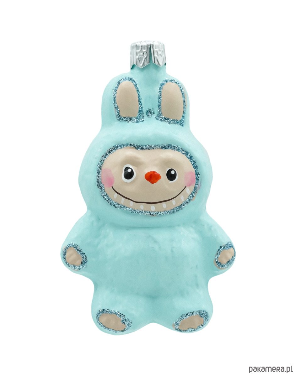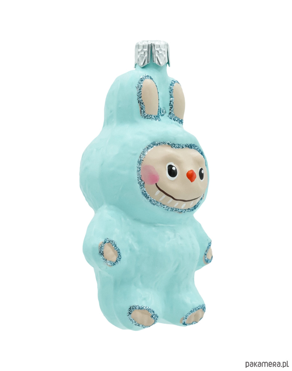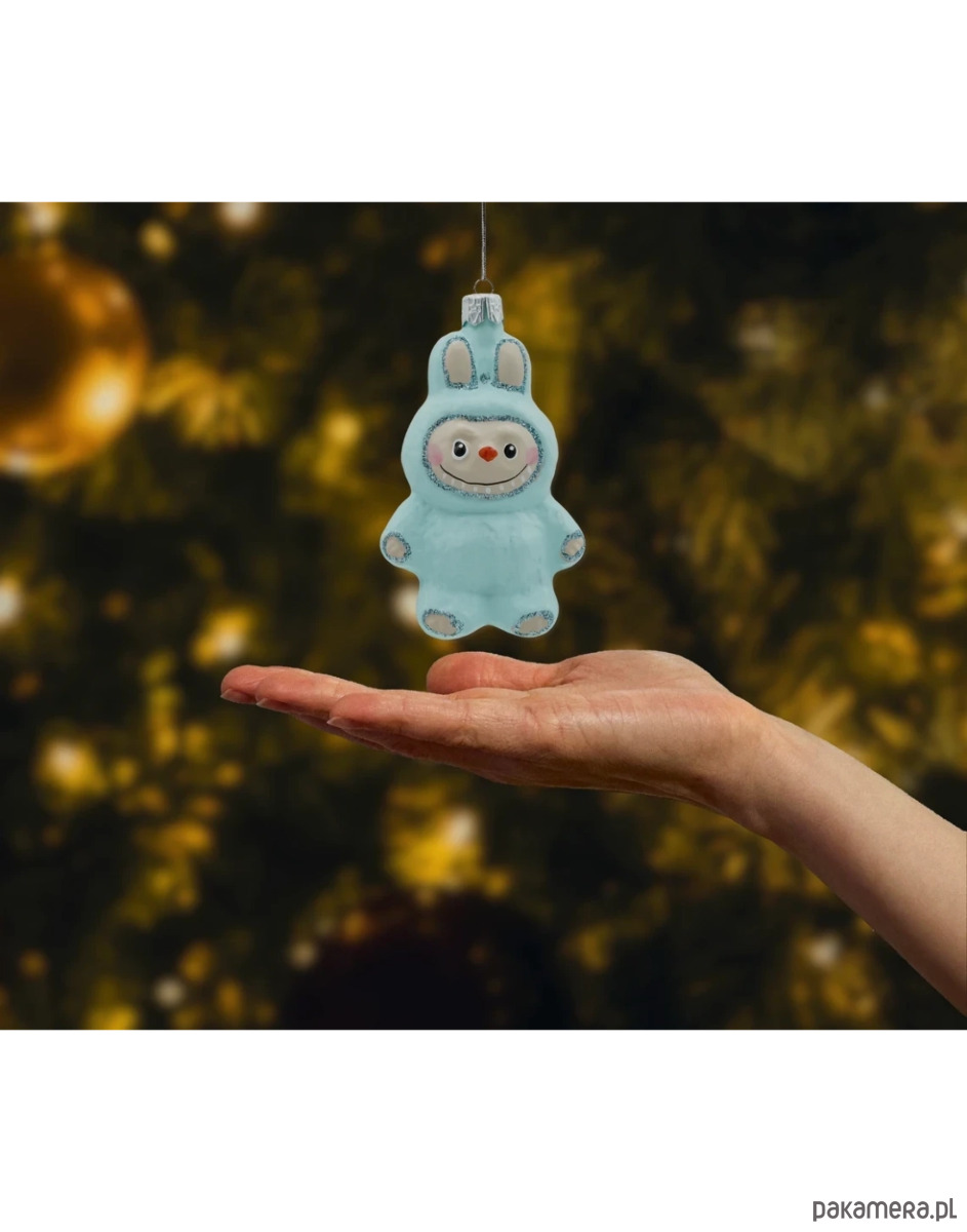 Urocza bombka szklana inspirowana postacią Labubu 10 cm to ręcznie formowana i malowana figurka w błękitnym, „puchatym” kombinezonie z króliczymi uszami. Delikatny połysk szkła, pastelowy kolor i srebrny brokat akcentują detale – od obwódki twarzy, przez łapki, aż po uszka. Sympatyczna buźka z marchewkowym noskiem natychmiast przyciąga wzrok i wnosi na choinkę odrobinę bajkowego humoru. To idealna bombka figurka dla miłośników kolekcji, nowoczesnych aranżacji oraz wszystkich, którzy chcą dodać świątecznym dekoracjom charakteru „designer toy”.