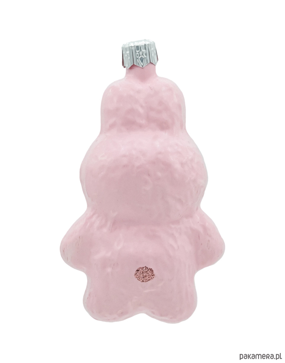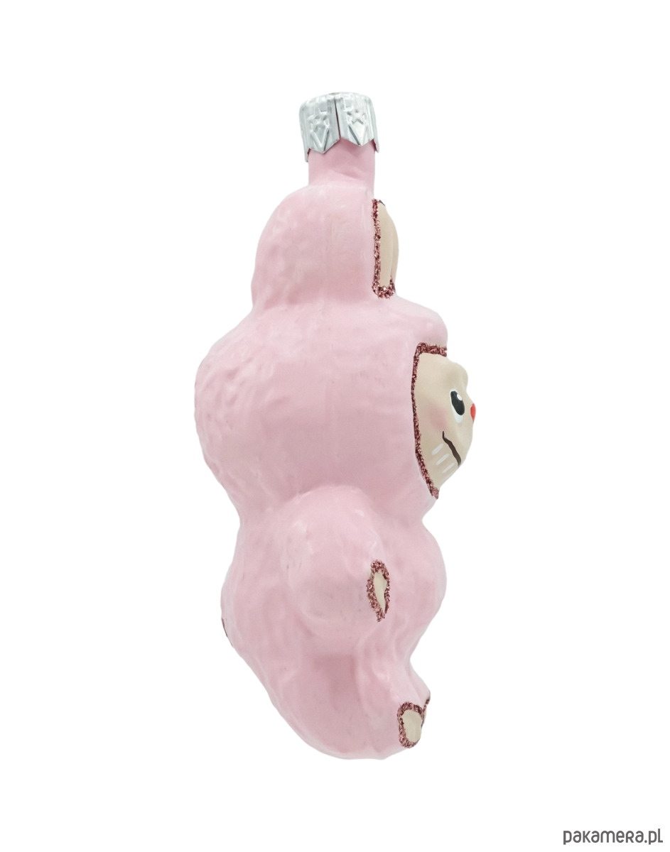 Wesoła, różowa figurka w stroju króliczka to ręcznie wykonana bombka z dmuchanego szkła, która natychmiast przykuwa wzrok na choince. Błyszczące, różowo-złote brokatowe lamówki (uszy, łapki, owal twarzy) pięknie kontrastują z pastelowym różem kostiumu, a uśmiechnięta buzia z czerwonym noskiem dodaje dekoracji ciepła i humoru. Każdy egzemplarz jest malowany pędzlem, dzięki czemu Twoja bombka jest jedyna w swoim rodzaju – idealna do nowoczesnych i klasycznych aranżacji świątecznych, a także jako uroczy prezent dla kolekcjonerów.