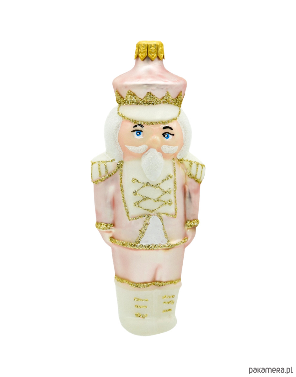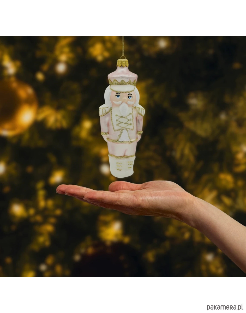 Wprowadź do swojej świątecznej aranżacji odrobinę bajkowego klimatu dzięki wyjątkowej bombce choinkowej w kształcie różowego dziadka do orzechów. Ta ręcznie malowana, szklana ozdoba zachwyca detalami i nietuzinkowym kolorem. Postać dziadka do orzechów w pastelowym odcieniu różu prezentuje się elegancko i subtelnie, idealnie wpisując się w modny styl glamour oraz klasyczne, baśniowe motywy świąteczne.