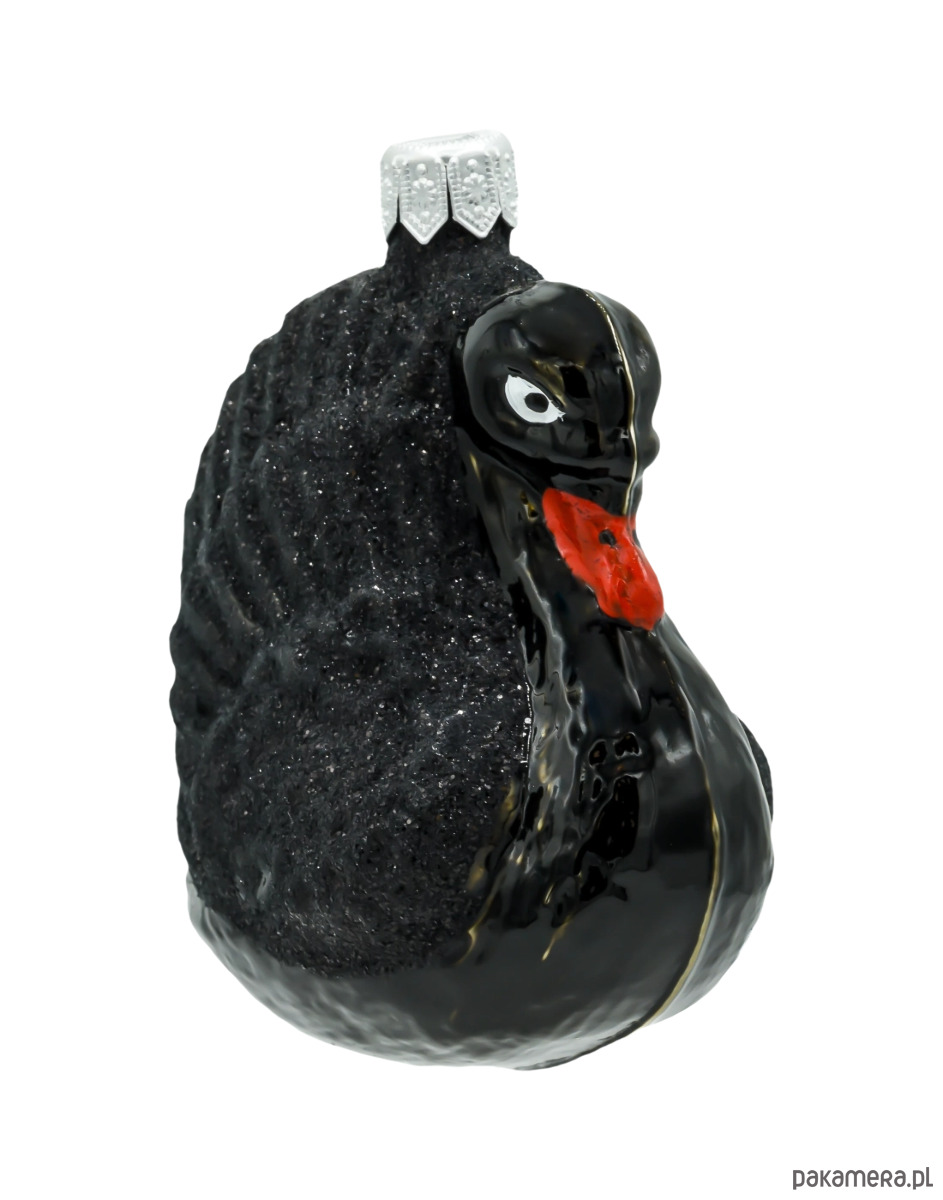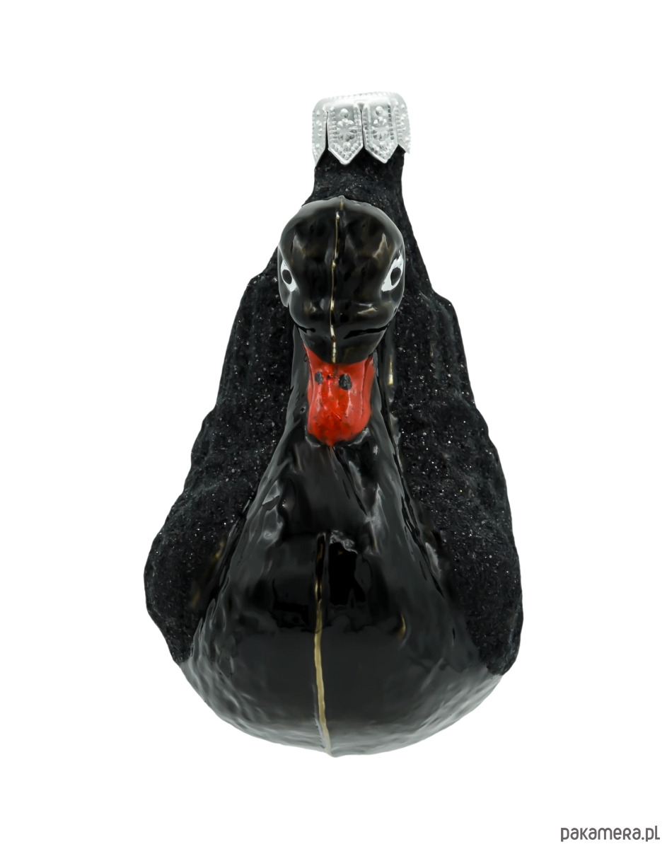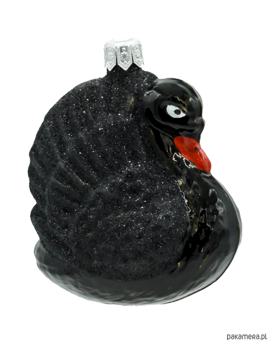 Bombka przedstawia majestatycznego czarnego łabędzia, symbolizującego elegancję i tajemniczość. Jego pióra pokryte są drobnym brokatem, który nadaje ozdobie subtelnego blasku, podkreślając jej luksusowy charakter. Czerwony dziób dodaje kontrastu i przyciąga uwagę.