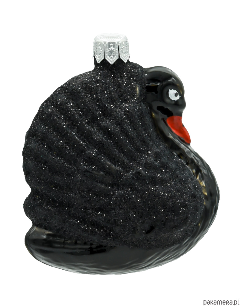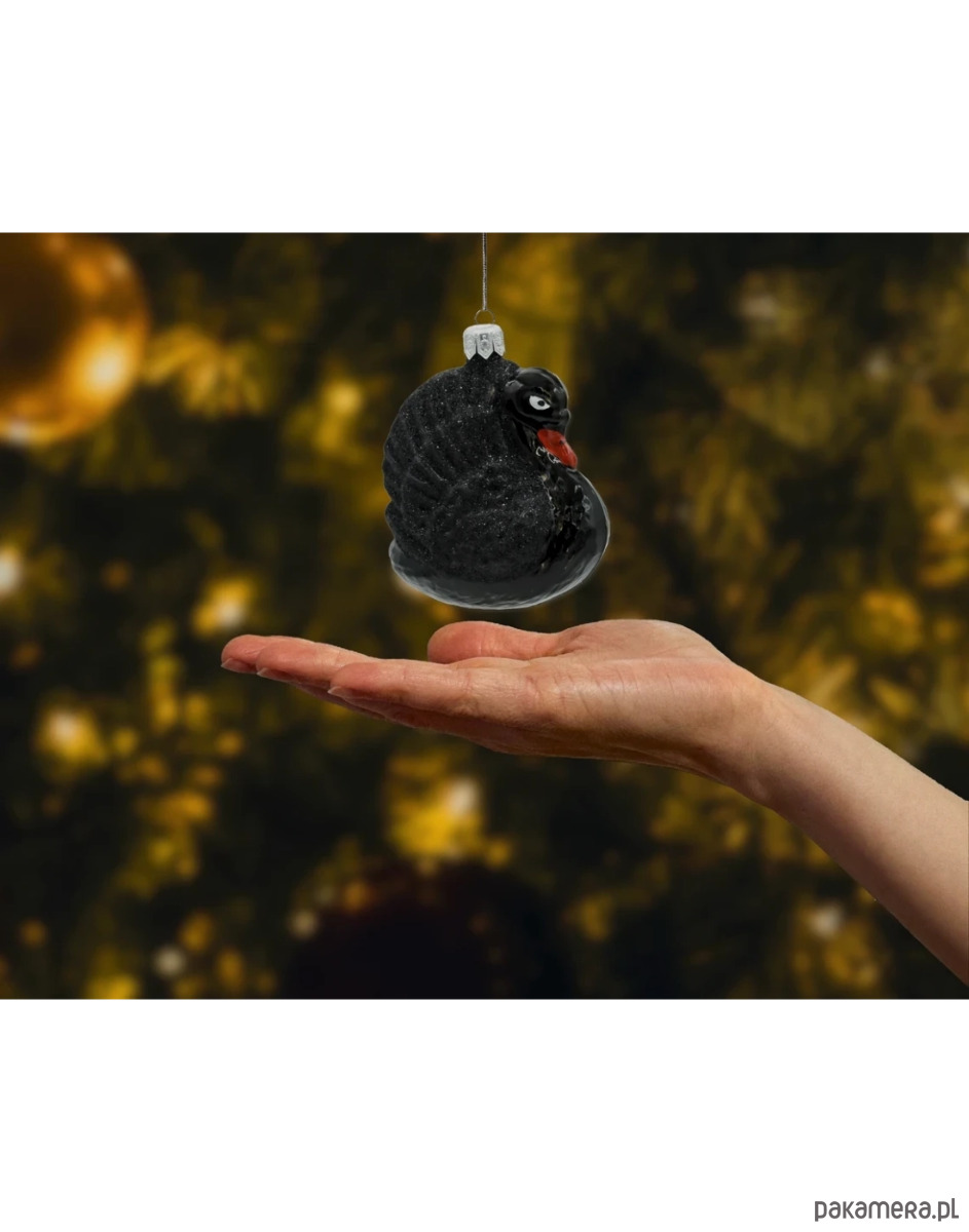 Nietuzinkowy kształt i motyw czarnego łabędzia wyróżniają tę bombkę spośród innych ozdób świątecznych.