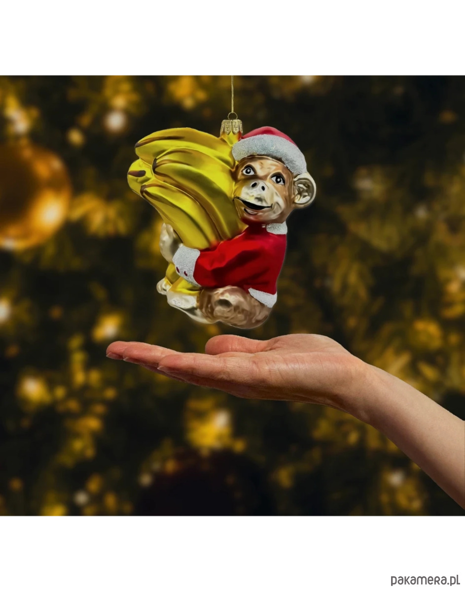 Ta świąteczna bombka z małpką trzymającą banany to idealny wybór dla tych, którzy chcą wprowadzić na swoją choinkę odrobinę humoru i radości, tworząc przy tym niezapomnianą, wesołą atmosferę świąt.