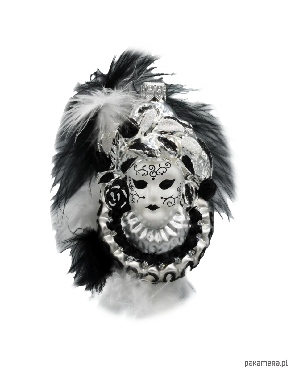 Szklana twarz w masce pokryta jest precyzyjnym, czarnym ornamentem z motywem wirujących zawijasów. Otaczają ją pióra w odcieniach bieli i głębokiej czerni, układające się w efektowną kompozycję przestrzenną. Dodatkowego blasku nadają bombce wkomponowane kamienie oraz metaliczne akcenty na kołnierzu i hełmowym nakryciu głowy. Całość tworzy spektakularną ozdobę, która przyciąga wzrok i nadaje aranżacji świątecznej charakter teatralnego glamour.