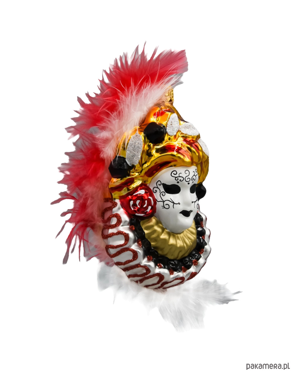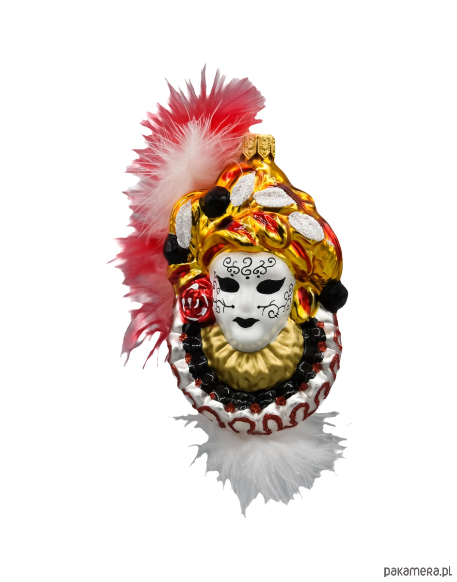 Zanurz się w magiczny klimat karnawału z wyjątkową bombką szklaną w kształcie maski weneckiej. Ręcznie malowana dekoracja zachwyca bogactwem detali i barw — od błyszczących złotych włosów po białą, porcelanową twarz z finezyjnymi ornamentami. Całość dopełniają głębokie czarne kontury, czerwony kwiat i bogata kryza w tonacji złota i bieli, ozdobiona czerwonym brokatem.