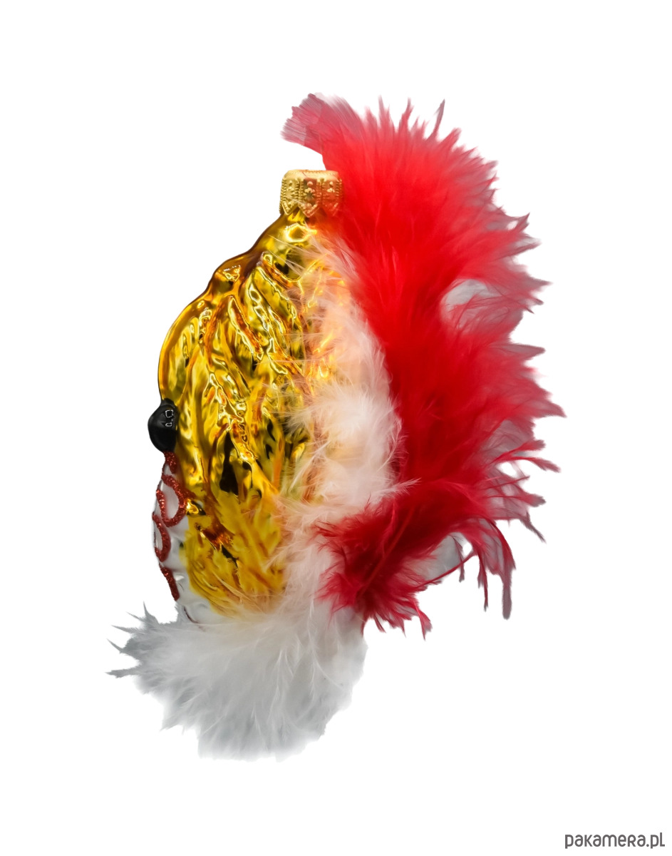 • Ozdobiona piórami w odcieniach czerwieni i bieli