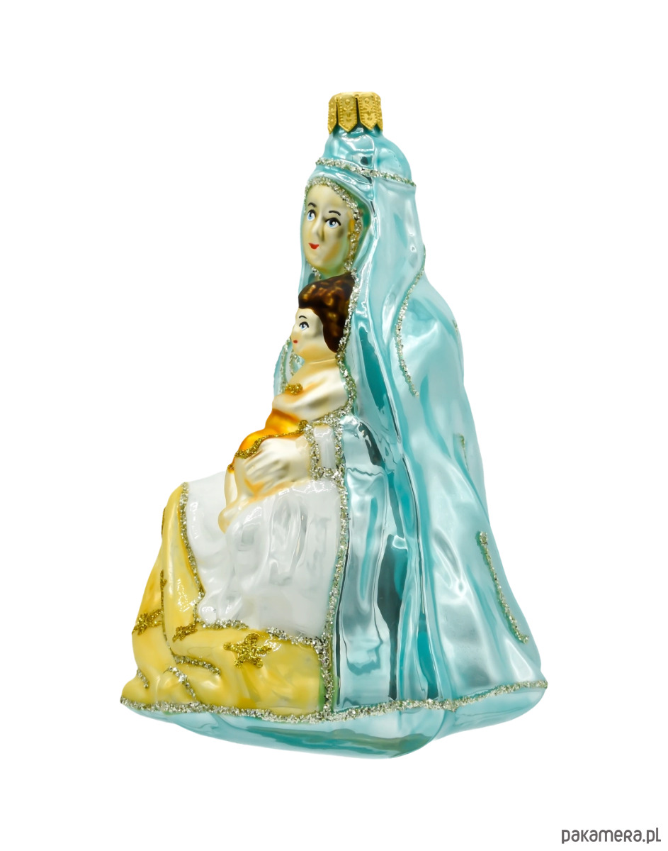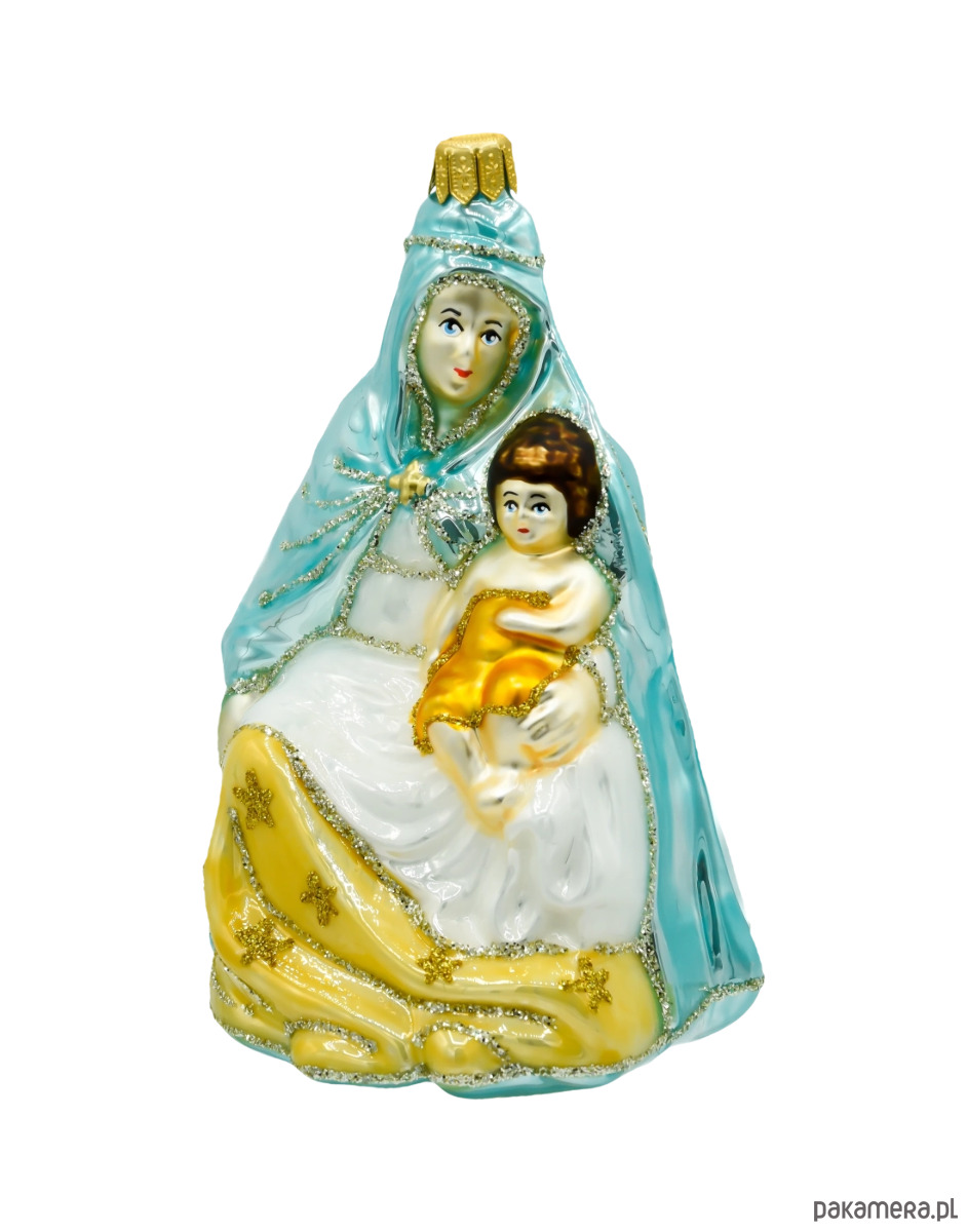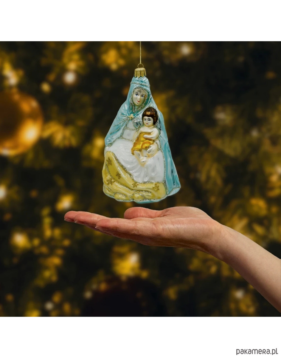 Wyjątkowa bombka choinkowa przedstawia Matkę Boską z Dzieciątkiem Jezus, ujętych w czułym i podniosłym geście macierzyństwa. Wykonana ze szkła i ręcznie malowana, zachwyca delikatnością detali oraz harmonijną kolorystyką. Szaty Maryi w błękicie i bieli ozdobione zostały złotymi gwiazdkami i brokatowym wykończeniem, które pięknie mienią się w świetle choinkowych lampek. Mały Jezus spoczywa na kolanach Matki, otulony w złotą tkaninę symbolizującą królewski majestat.