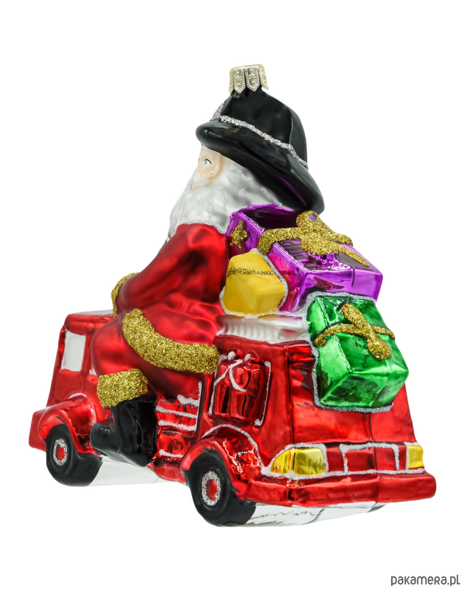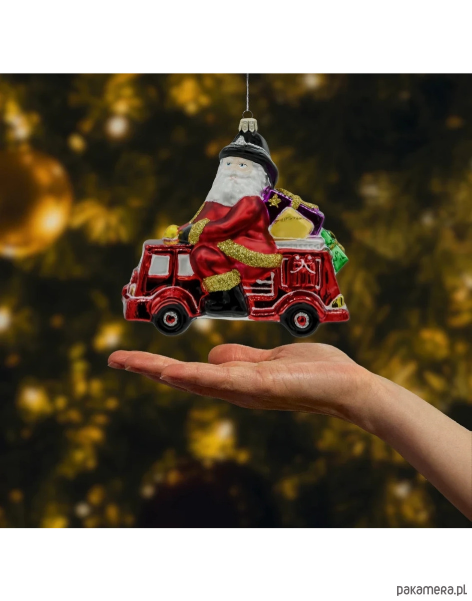 Prezent świąteczny dla strażaka, fana motoryzacji, kolekcjonera szklanych ozdób, a także jako upominek mikołajkowy dla dzieci.
