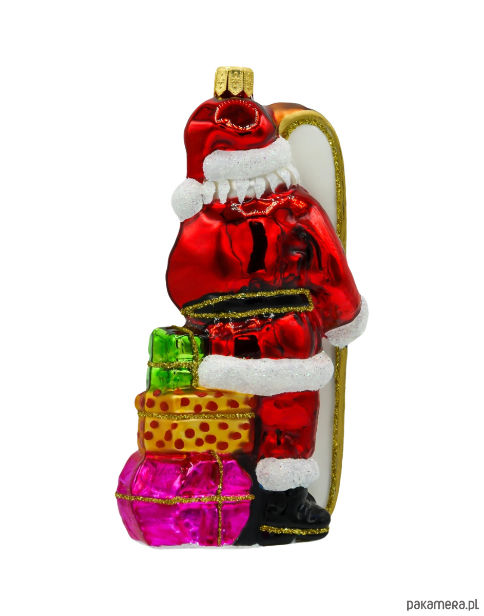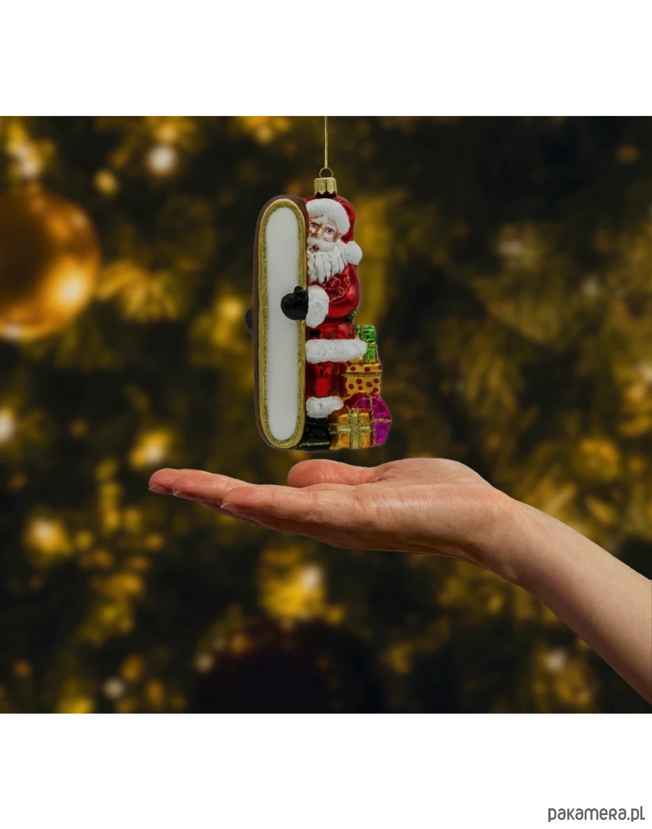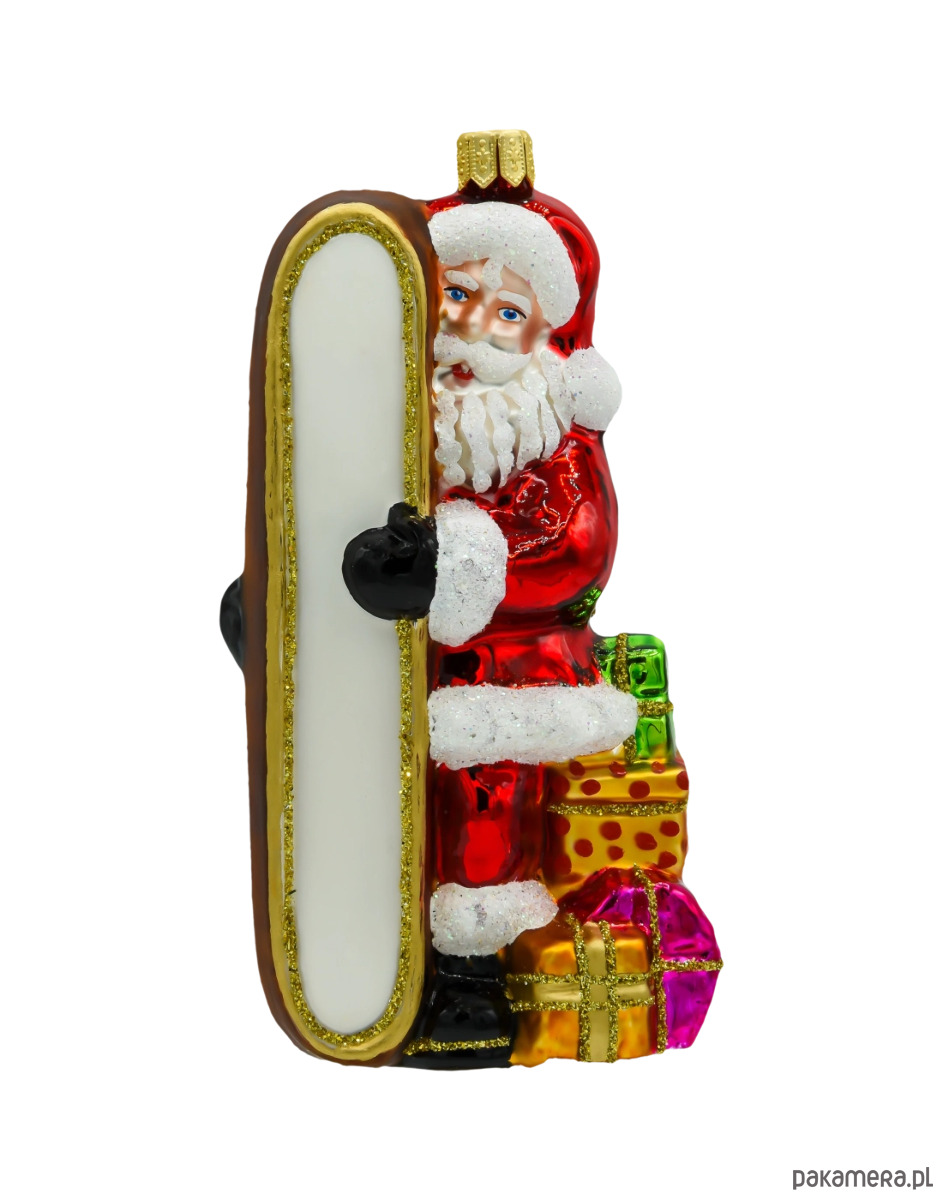 Największą atrakcją bombki jest duża, pionowa tablica z połyskującym złotym obramowaniem – idealna do personalizacji markerem kredowym lub flamastrem permanentnym. Możesz dopisać na niej imię, datę, życzenia lub dowolne hasło, co czyni tę ozdobę nie tylko dekoracją, ale również oryginalnym, spersonalizowanym prezentem świątecznym. U stóp Mikołaja znajduje się stos barwnych prezentów w odcieniach zieleni, złota, różu i czerwieni, które nadają bombce radosny, bajkowy charakter.