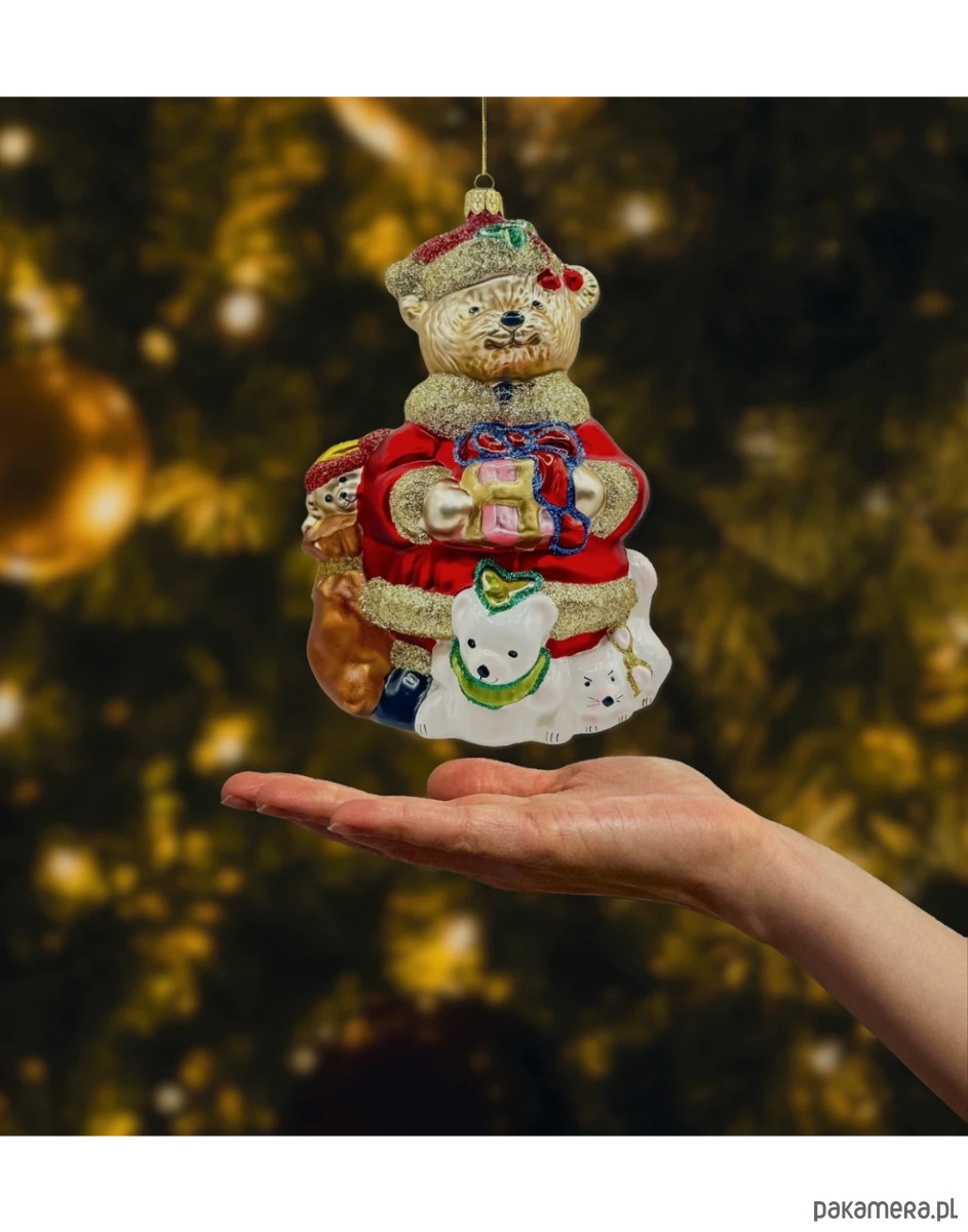 Bombka w kształcie misia Mikołaja, który niesie prezenty, otoczony uroczymi zwierzątkami, symbolizuje radość i świąteczne niespodzianki.