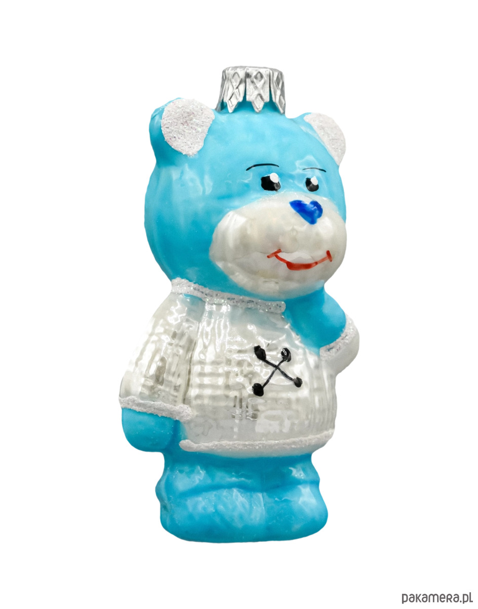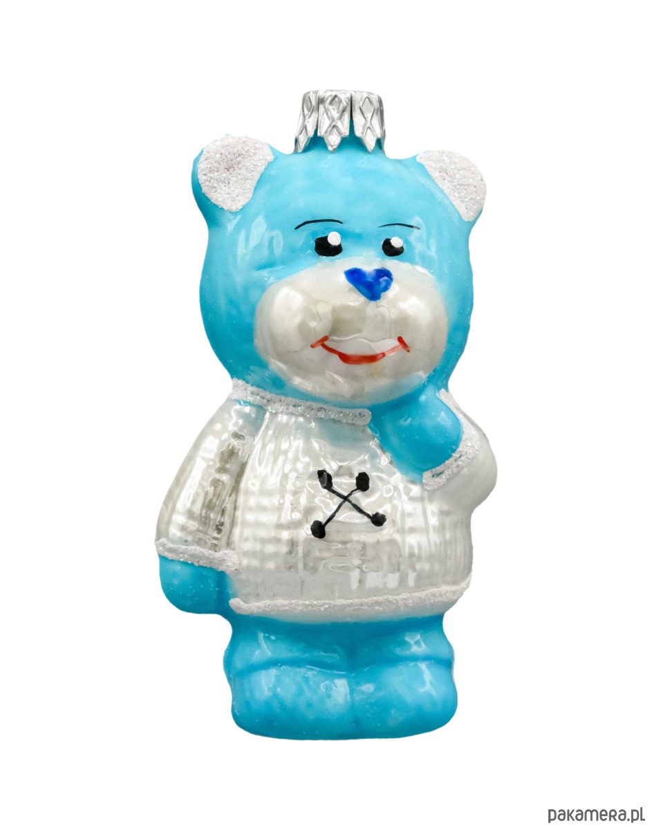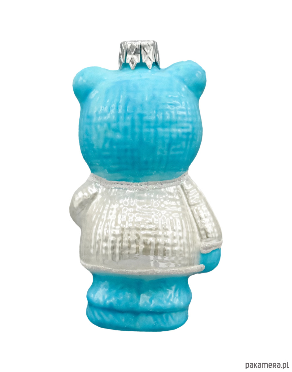 Motyw: Uroczy niebieski miś z białym sweterkiem, ozdobionym delikatnymi akcentami, które dodają mu elegancji. Detale takie jak srebrne wykończenia i subtelne zdobienia podkreślają unikalny charakter ozdoby, nadając jej wyjątkowego uroku.