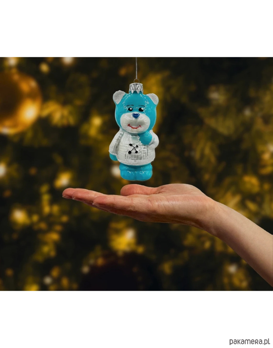 Kolorystyka: Intensywny, niebieski odcień misia kontrastuje z bielą jego sweterka, tworząc harmonijną kompozycję. Srebrzyste akcenty dodają bombce blasku, a ręcznie malowane detale sprawiają, że ozdoba pięknie odbija światło choinkowych lampek, tworząc magiczny efekt.