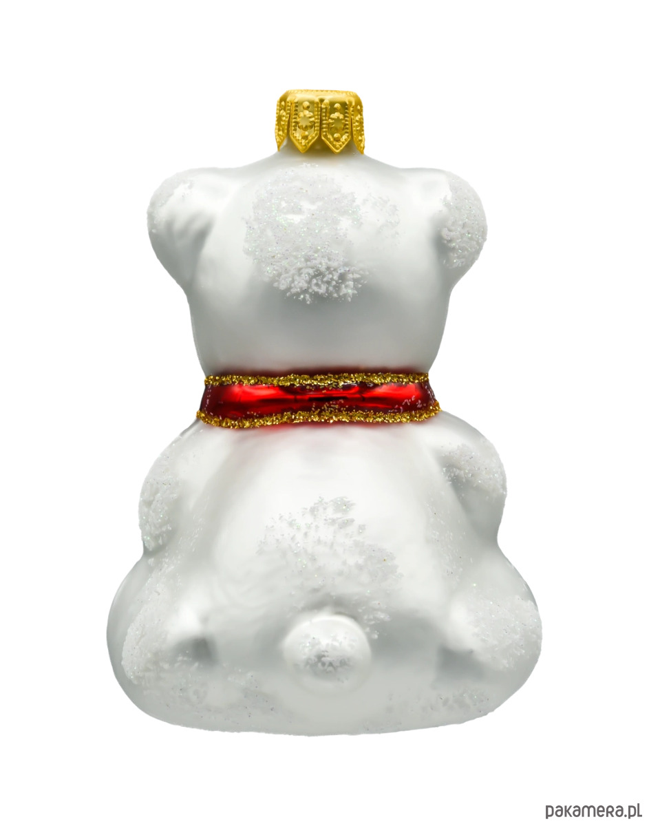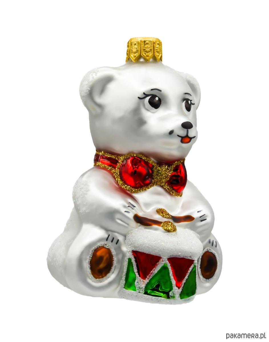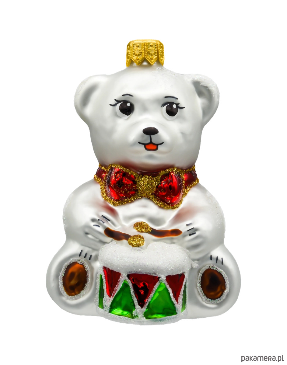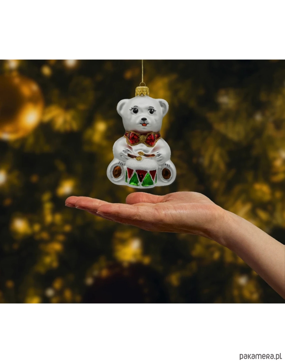 Bombka przedstawia siedzącego białego misia o miękkim, brokatowym futerku, który w łapkach trzyma kolorowy bębenek zdobiony zielono-czerwonymi trójkątami. Miś ubrany jest w elegancką, błyszczącą czerwoną muchę ozdobioną złotym brokatem. Jego słodki uśmiech i urocze spojrzenie sprawiają, że trudno przejść obok niego obojętnie – to dekoracja, która urzeka od pierwszego wejrzenia.