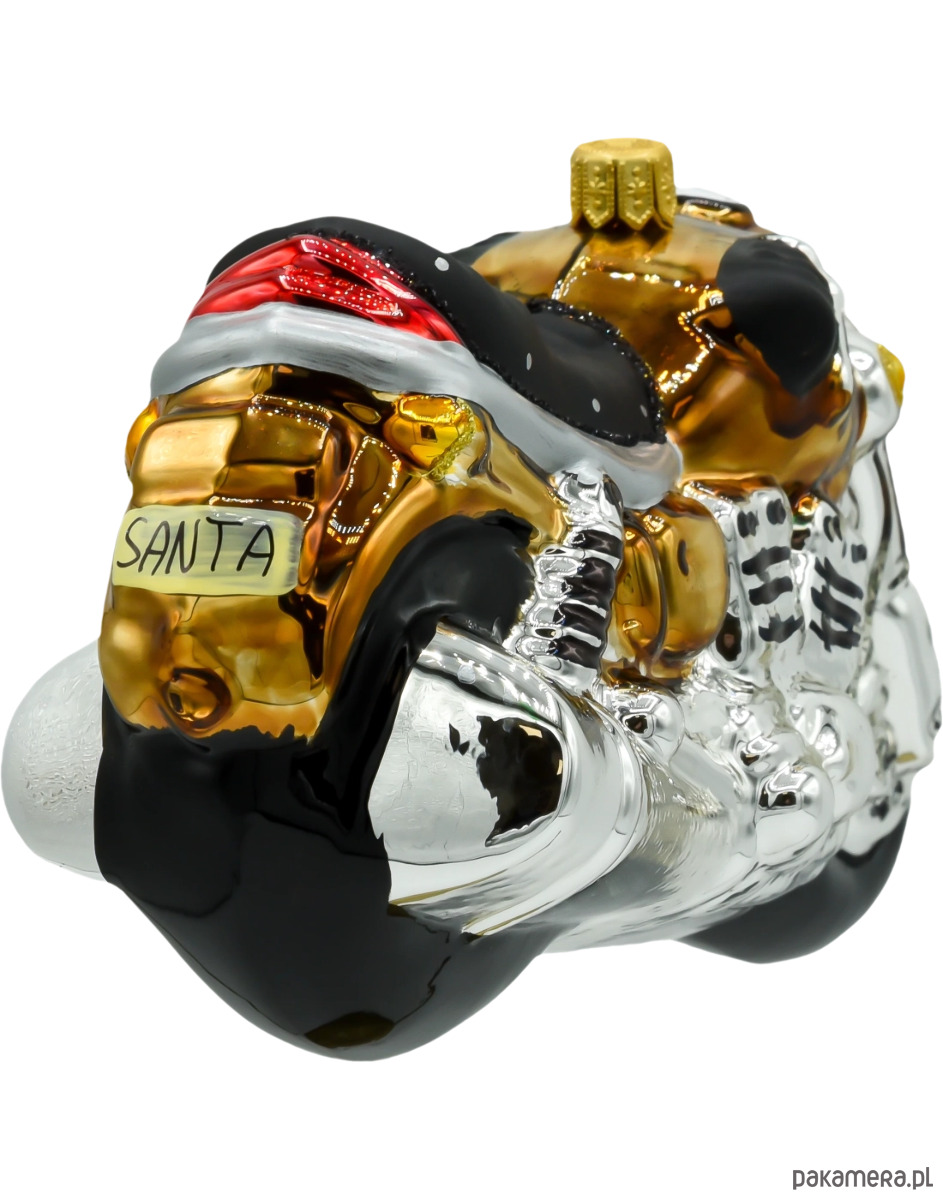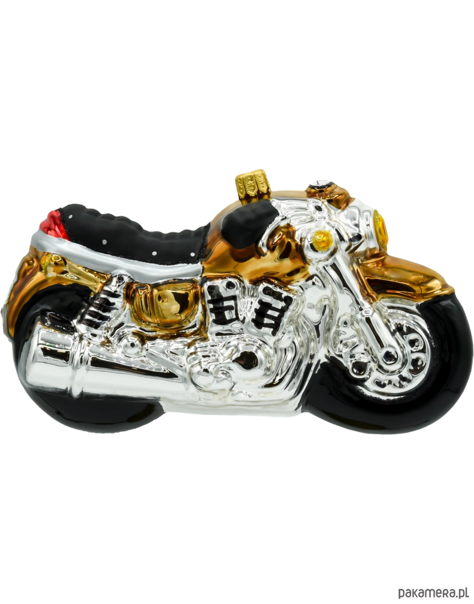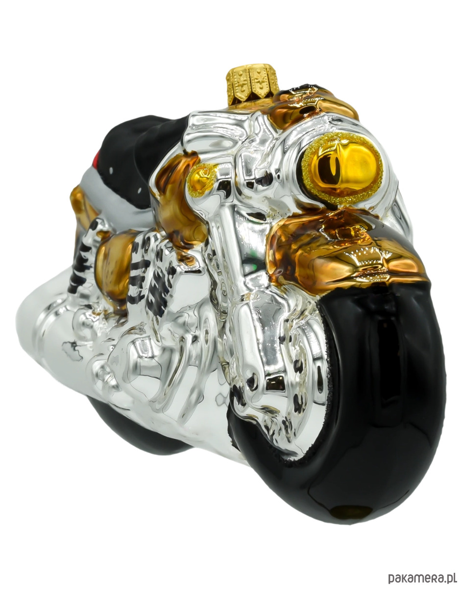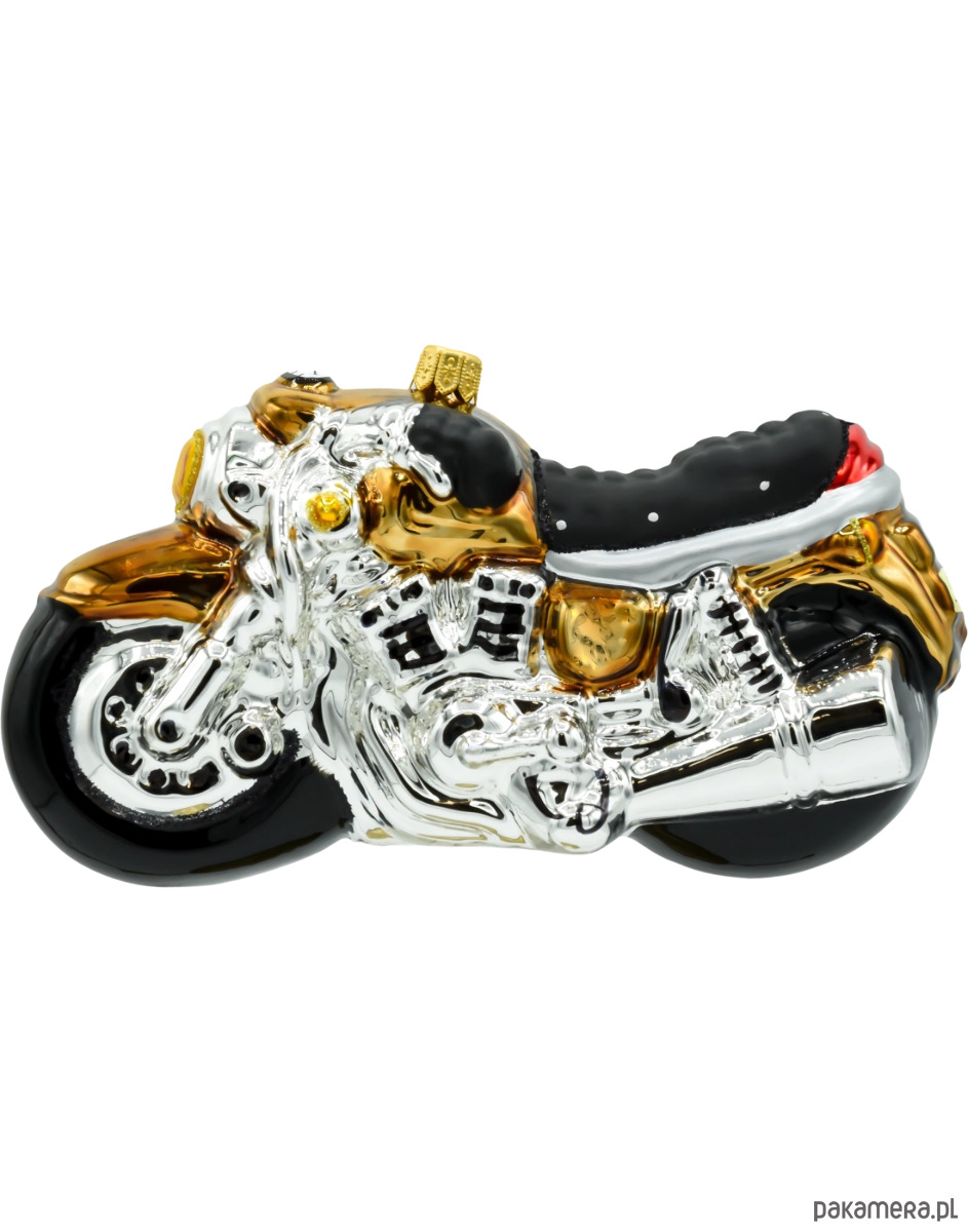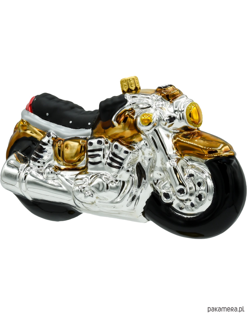 Motocykl mieni się srebrnymi i złotymi akcentami, co dodaje mu elegancji i blasku. Złote detale, takie jak reflektor, kierownica oraz wykończenia silnika, pięknie kontrastują z klasycznym, srebrnym wykończeniem nadwozia, tworząc bombkę, która przyciąga wzrok i będzie centralnym punktem na świątecznym drzewku. Ta bombka doskonale komponuje się z nowoczesnymi dekoracjami, wprowadzając odrobinę motoryzacyjnego stylu i elegancji do wnętrza.