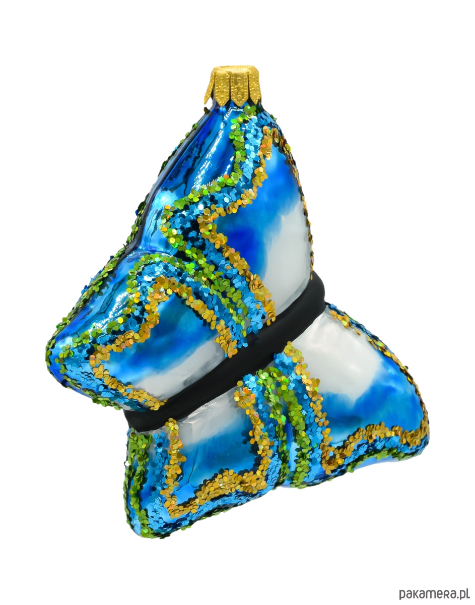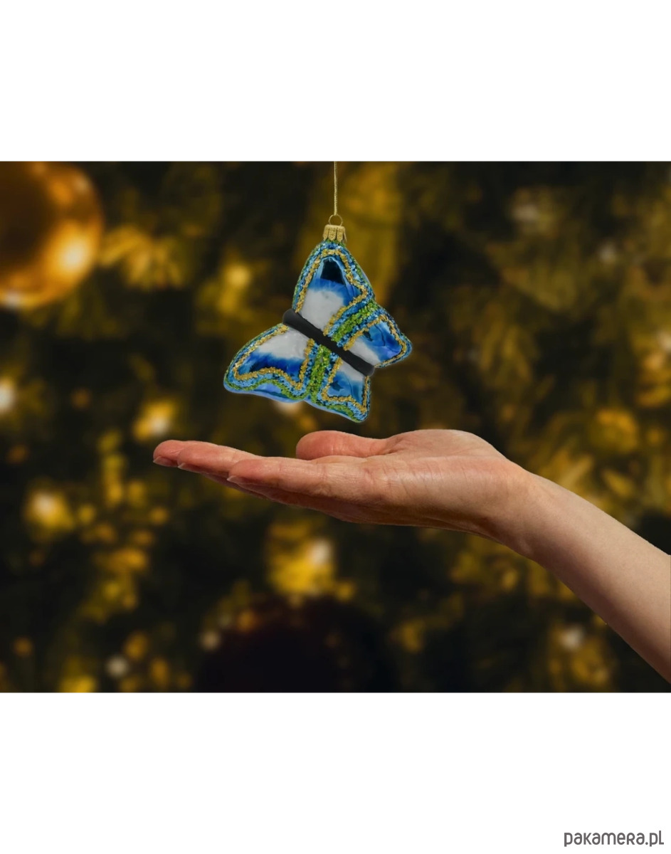Zachwycająca szklana bombka choinkowa w kształcie motyla to prawdziwa perełka wśród świątecznych ozdób. Utrzymana w odcieniach błękitu, granatu i bieli, z wyrazistym czarnym tułowiem oraz niezwykle efektownym, brokatowym zdobieniem w postaci cekinów w kolorze złotym, zielonym i niebieskim. Każde skrzydło motyla lśni dzięki ręcznemu malowaniu i zdobieniom, które podkreślają lekkość i elegancję tej ozdoby.