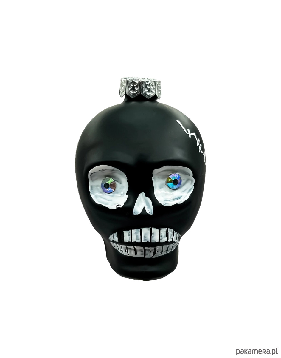 Szklana bombka w kształcie czaszki z czarnym matowym wykończeniem, które dodaje jej głębi i elegancji.
