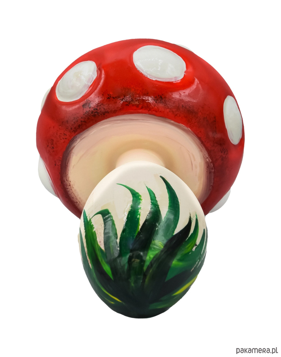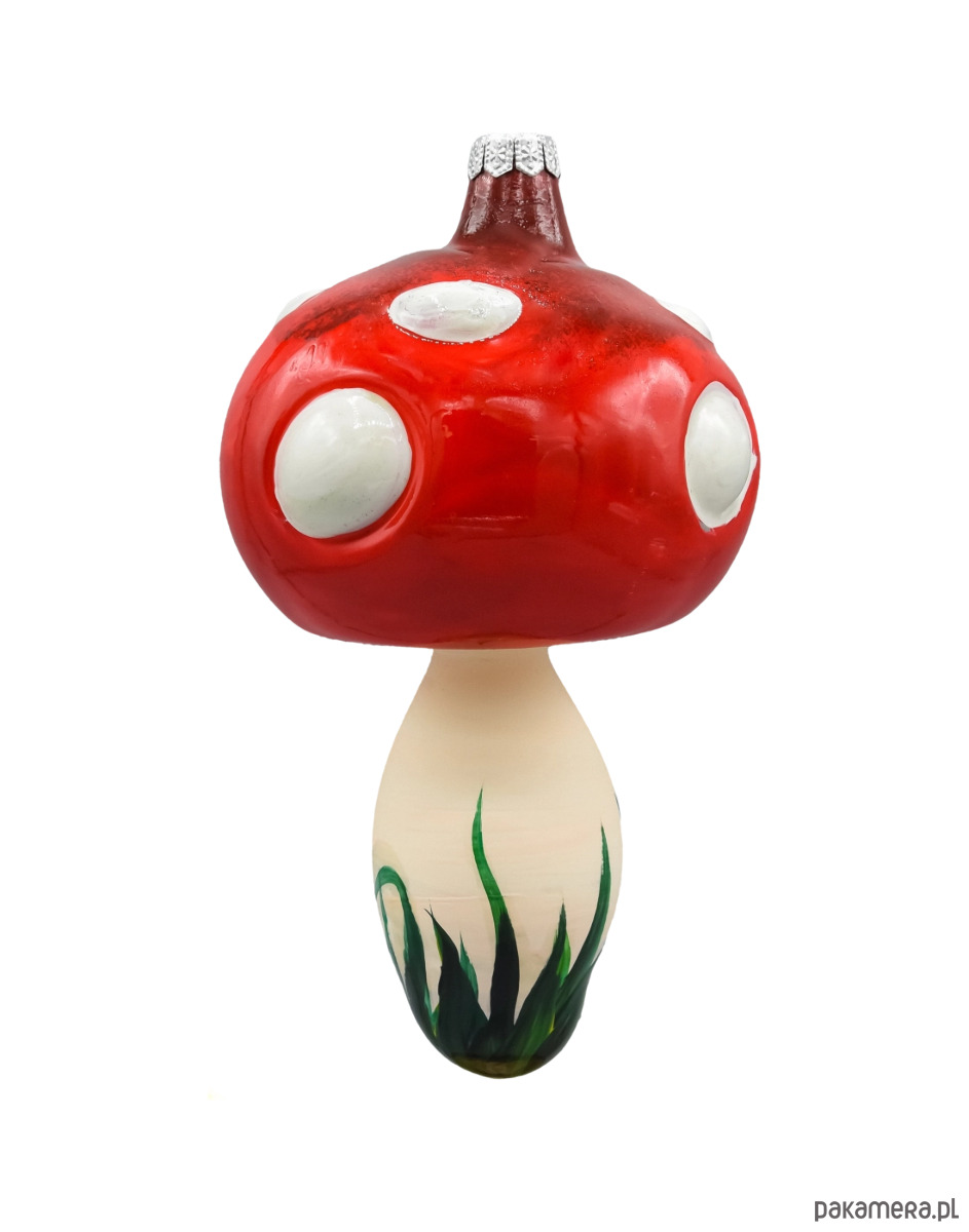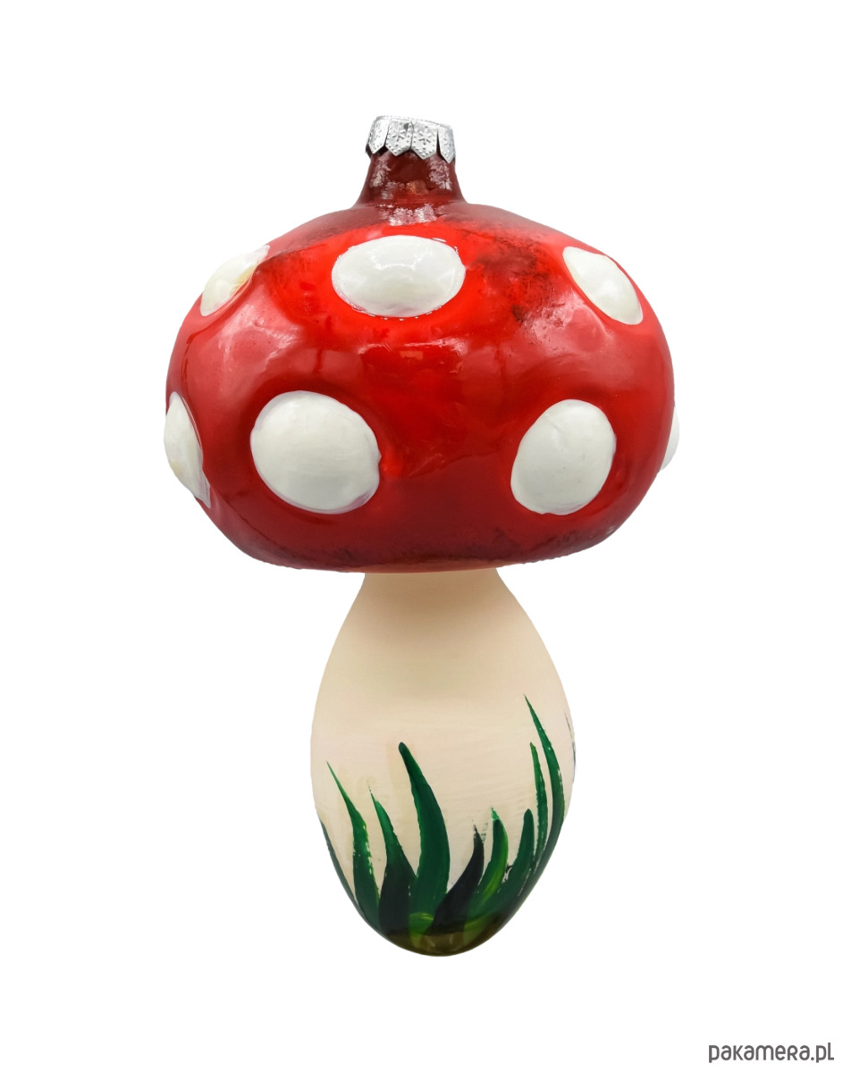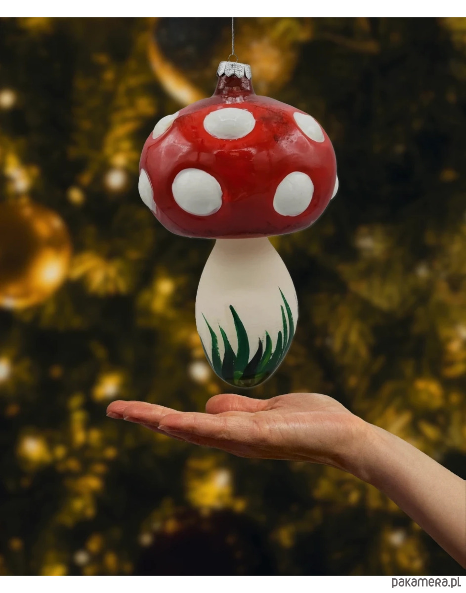 Szklana bombka w kształcie muchomora to urocza propozycja dla miłośników natury i bajkowych motywów. Ręcznie malowany kapelusz w intensywnej czerwieni z białymi kropkami natychmiast przyciąga wzrok i dodaje kompozycji świątecznego uroku. Jasny trzonek z delikatnie zaznaczoną trawą podkreśla naturalny charakter ozdoby. Ta bombka to doskonały wybór do leśnych aranżacji choinkowych i rustykalnych wnętrz – wnosi ciepło, radość i odrobinę nostalgii.